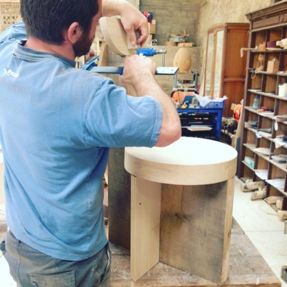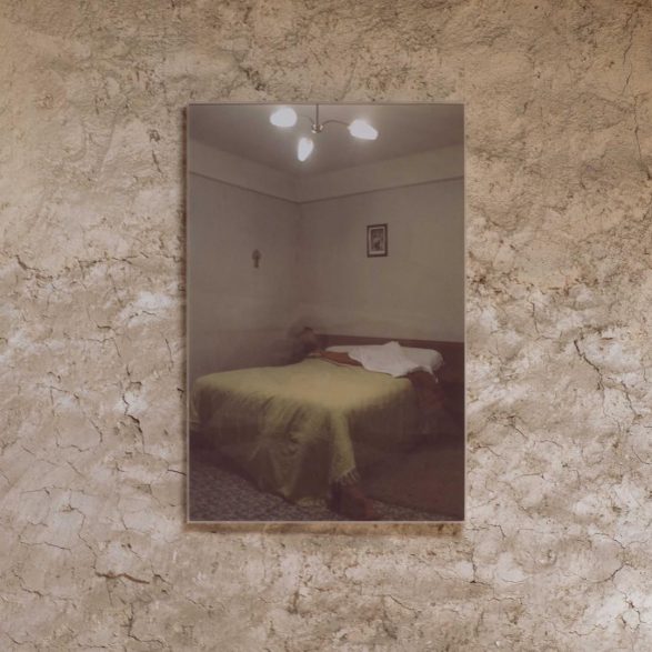 Une maison abandonnée dans le village de Nicey-sur-Aire. Quelques nids d’hirondelles encore habités et puis des chutes de plastique bulle au sol, des clous. Aucun meuble mais des étagères visiblement neuves, en métal, très sobres, aux belles proportions. Contre un mur au papier peint défraîchi, déchiré par endroit, une grande photographie sous plexiglas qui laisse deviner une chambre, un lit, une couverture vert anis. De plus petits formats commencent à trouver leur place sur les murs dénudés, près de l’immense cheminée hors d’usage. Deux, ou trois, ou plus ? Julien Carreyn et Benoît Maire finissent l’installation de l’exposition « Chez Bergeron. » Les deux artistes collaborent pour la deuxième fois, après l’exposition « Photographie du soir » à la galerie Crèvecœur au printemps. Benoît y conçoit la scénographie du travail photographique de Julien, apporte son œil pour la mise en espace, et propose le mobilier Ker-Xavier, pensé et produit par un collectif de trois architectes dont il fait aussi partie. Il aime dire une « architecture élargie », à d’autres disciplines, qui fait travailler en amont des artisans, des producteurs. Depuis 2010, les nouvelles perspectives de son travail l’amènent du socle à la sculpture, au meuble. « Chez Bergeron » verra donc une table et une chaise en chêne et charme, conçues spécialement pour l’exposition et fabriqués par Jean Bergeron qui travaille dans l’atelier jouxtant la maison.