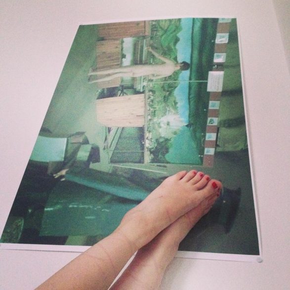 Ce travail d’équipe, Julien l’a à nouveau souhaité. Ker-Xavier investit les différents espaces de la maison de Nicey, dialogue subtilement avec ses photos, nées de ses errances pendant plusieurs mois sur le territoire meusien. Le rural n’est pas forcément son milieu de prédilection, mais sortir d’un contexte apporte de l’imprévu, du surprenant, et beaucoup de disponibilité, de générosité. Des casses automobiles, des chevaux, des lieux abandonnés, des modèles improvisés, tout était là pour une mise en scène impressionniste, où le déjeuner sur l’herbe retrouve comme à l’origine sa nature follement drôle, fantaisiste. Le mélange est subtil, érotique, troublant. Le traitement numérique sublime l’impression de photo amateur, liée au contexte tout comme au format 35 mm et au tirage taille carte postale. Personne n’est dupe. Un nu traverse l’image, chacun se raconte son histoire, une histoire enfouie peut-être, un souvenir, vrai ou faux. L’absence de cadre autorise le hors-champ, l’œil vagabonde sur le mur, l’escalier. Les ombres masquent partiellement les tirages, assumées. Les images complices proposent une digression douce, un va-et-vient, comme du sommeil à l’éveil, sans inquiétude. Pourtant, tout est vivant.