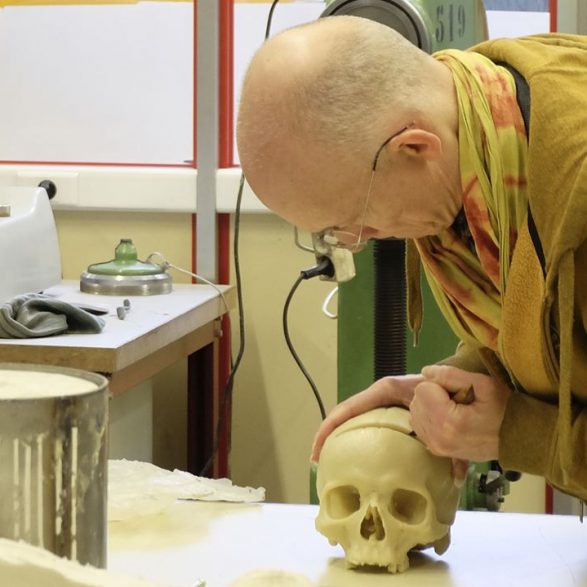 Une création a priori peu commune pour un moule à gâteau. Peu importe pour la petite structure familiale Wehrling de Soufflenheim, spécialisée dans la fabrication de moules à Kouglof. Réaliser un moule pour des gâteaux en forme de crâne humain est un défi relevé avec aisance pour le père et la fille, pas si éloigné que cela de la tradition de motifs religieux présente dans leur artisanat. Aussitôt le modèle de l’artiste Erik Nussbicker entre leur main, ils en réalisent un premier moulage.