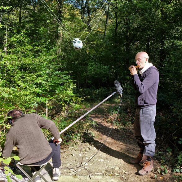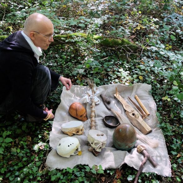 Le chant des oiseaux, le bruissement des feuillages, le miroitement du soleil offrent un support parfait à qui veut apaiser son esprit et communier avec la nature qui l’entoure. Erik Nussbicker n’est pas avare de sa connaissance intime de la matière, de sa faculté à révéler les sentiments les plus subtils. Il transmet, enseigne, partage. À Vent des Forêts, il collabore avec le potier marnais Richard Osik qui façonne pour lui ses nichoirs, avec la famille Wehrling qui fabrique ses moules à kougelhof et le lycée Loritz dont deux élèves s’appliquent à fondre les crânes en bronze destinés à résonner dans la forêt. Ces motifs de vanité, qui peuplent habituellement les cabinets de curiosité, ne font pas ici partie d’une collection exposée – incitant, certes, à la réflexion – mais sollicitent le mouvement, le geste réfléchi, presque intime, à la manière de ceux requis par la pratique du Qi Gong. Un espace de sérénité se crée aux limites du sacré, en équilibre entre les traditions occidentales et les philosophies orientales, ces dernières étant plus familières de l’impermanence, du mouvement perpétuel et du renouvellement fécond de l’univers dont nous faisons partie intégrante.