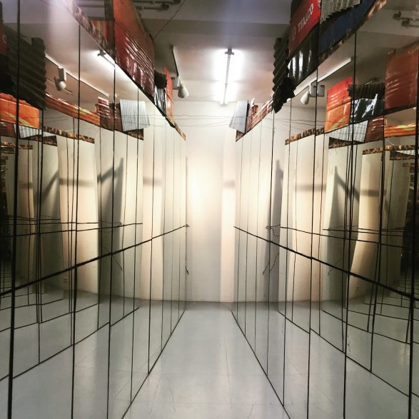 A Dompcevrin, c’est une pièce monumentale qu’il a construit, assisté d’un jeune volontaire en service civique à Vent des Forêts. L’œuvre prend la forme d’une reconstitution artistique d’une rue de bidonville, comme on en trouve dans les camps de réfugiés du monde entier. Abdul Rahman Katanani utilise, pour cette construction, des bidons métalliques qu’il aplatit, tord, soude et sur lesquels il assemble d’autres matériaux de récupération. Il y intègre également des miroirs pour créer une « galerie des glaces » et démultiplier l’espace et l’image des visiteurs. Ce travail a également servi pour le tournage d’une courte vidéo qui fera partie de l’exposition et dans laquelle des bénévoles de Vent des Forêts et de jeunes migrants accueillis à Saint-Mihiel ont été invités à être figurants.