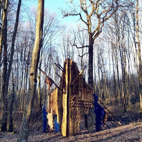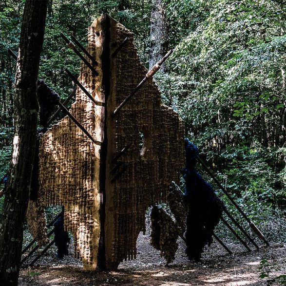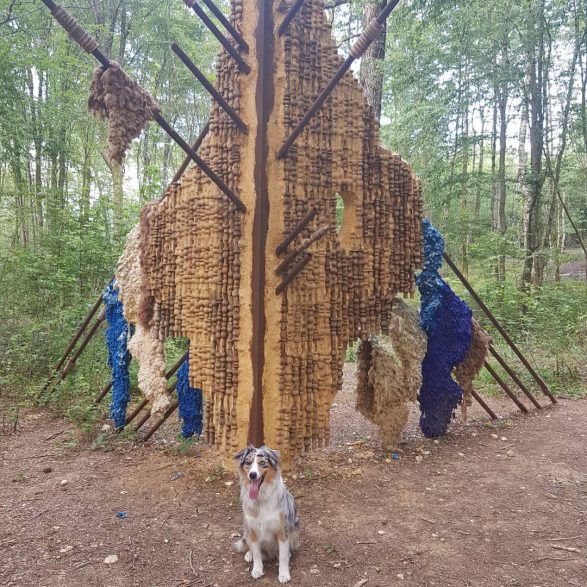 212Amandine Arcelli offre une sculpture à l’échelle de la forêt née d’un mariage spectaculaire : 350 pièces de bois tourné en chêne, mélèze, pin de Douglas et acacia affleurent d’une matrice de mortier jaune vif arrimée à une immense structure d’acier. Elles portent de grands canevas de laine de mouton brute, teintée en noir et bleu vif. Cette forme résulte de la mise en œuvre exubérante de techniques architecturales et de savoir-faire artisanaux locaux. Insolite, l’œuvre pourrait évoquer un gigantesque bouclier ou une présence animale extraordinaire, cependant son titre \ ʁu.ba.to \ fait référence en musique à la liberté d’interpréter une partition à son rythme, liberté dont l’artiste fait preuve ici dans le champ sculptural.