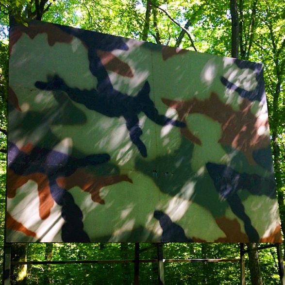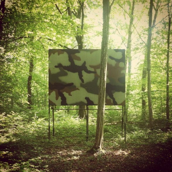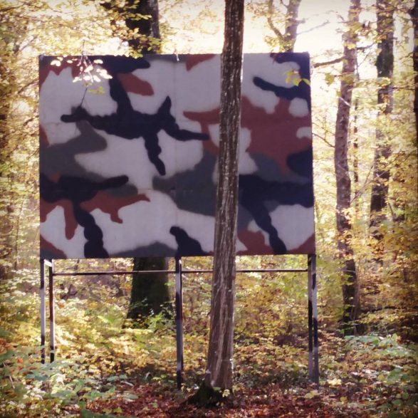 110Miguel-Angel Molina peint une plaque d’acier de 4 x 3 m aux couleurs des treillis militaires. Le motif du camouflage, emprunté ici à l’inventeur de la veste « léopard », le peintre lorrain membre de l’Ecole de Nancy Louis Guingot, servit dans un premier temps à dissimuler l’artillerie pendant la Première Guerre mondiale. L’artiste choisit pour format de son tableau les dimensions utilisées pour les affiches publicitaires, opposant ainsi deux volontés contradictoires : se cacher et se montrer, un jeu ambivalent qui est celui du guerrier, du chasseur, de l’animal. Le titre de l’œuvre, qui suggère un calcul dont la somme est nulle, illustre tout à fait ce paradoxe.