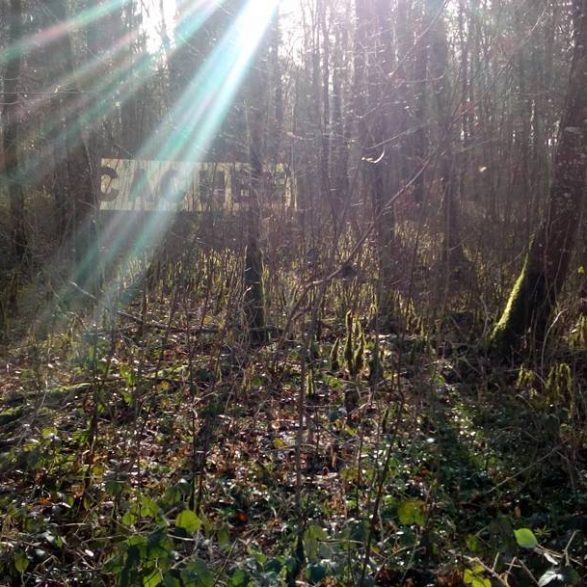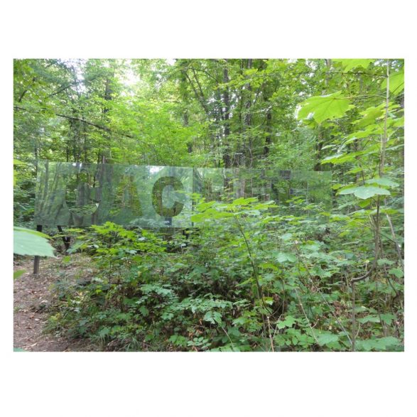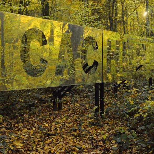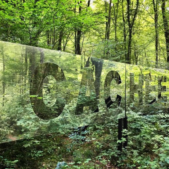 128Lorentino a recours au procédé de représentation le plus direct : un grand miroir panoramique en plexiglas dont il extrait les lettres du mot « CACHÉE ». C’est paradoxalement grâce à la partie évidée, absente, que l’œuvre est visible, elle apparaît grâce à la réflexion du paysage sur la surface. Les lettres issues de la découpe sont dispersées dans une autre partie de la forêt, ce qui crée un espace virtuel, un lien entre les deux œuvres et questionne habilement l’idée de vide et de plein.