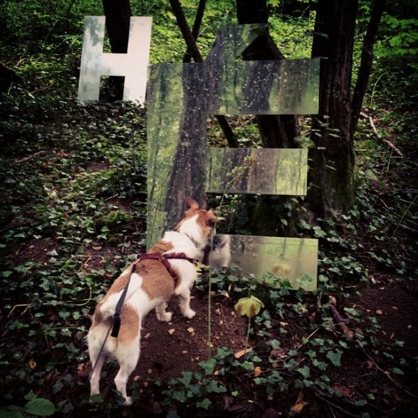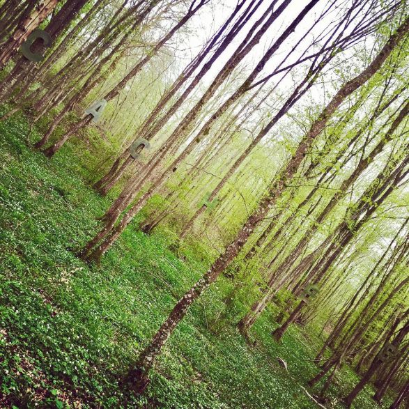 128 bisLorentino a recours au procédé de représentation le plus direct : un grand miroir panoramique dont il extrait les lettres du mot « CACHÉE ». Ces lettres sont agencées dans une partie de forêt dégagée et reconstituent le mot dans l’espace, visible grâce à la réflexion du paysage sur la surface. L’œuvre Cachée apparaît donc uniquement dans ce contexte et dialogue avec la matrice du miroir évidée, installée dans la forêt de Marcaulieu (circuits de Marcaulieu et du Gros Caillou).
