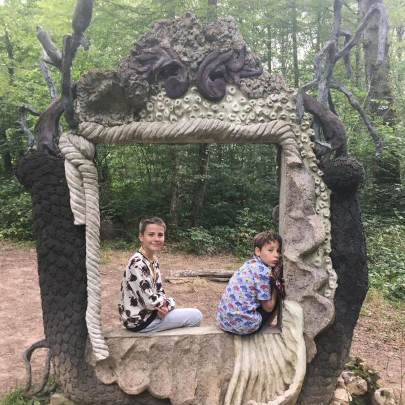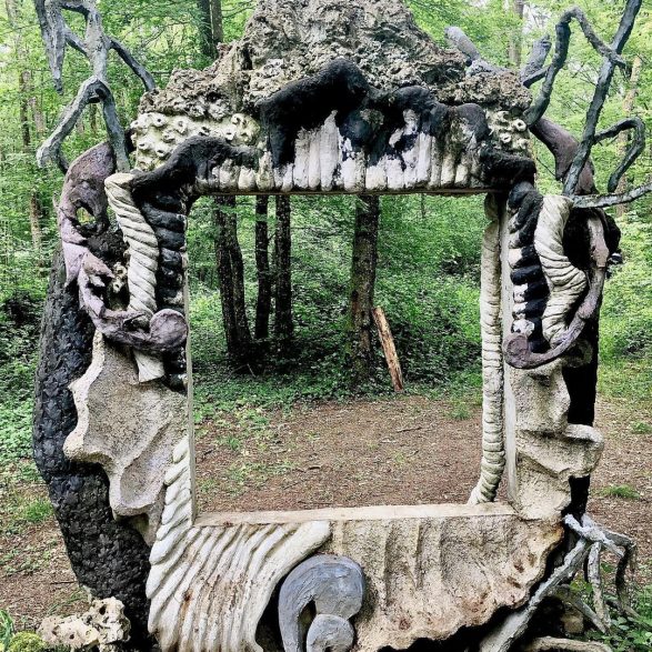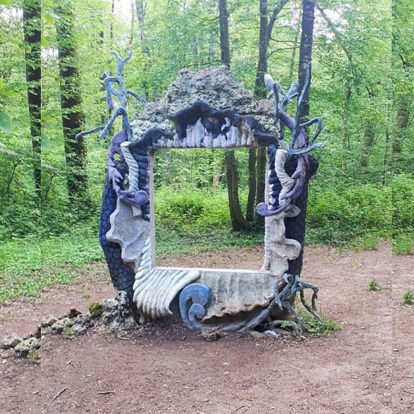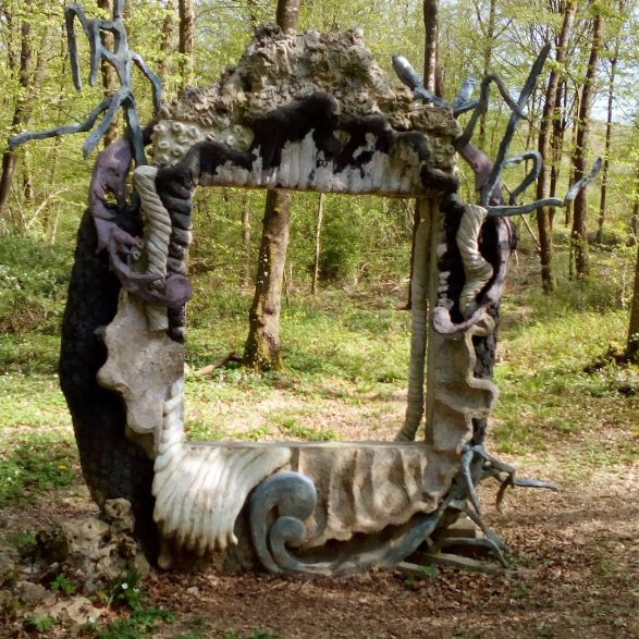 185Marion Verboom construit un motif architectural rocaille à double titre : par son décor exubérant de coquillages, coraux et végétaux inspirés des cartouches Rococo de Jacques de Lajoüe (ornemaniste du XVIIIe siècle) et par la technique employée, celle du ciment travaillé autour de grillages, appelée au XIXème siècle « rocaille ». Elle crée ainsi en forêt un cadre enchanté aux formes opulentes et aux demi-teintes pastel.