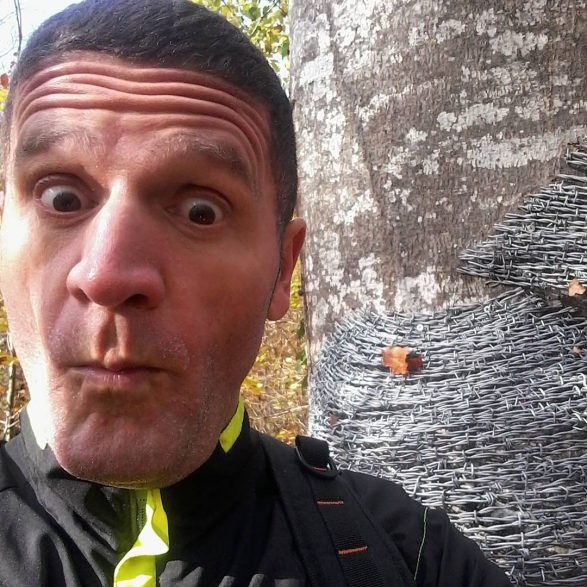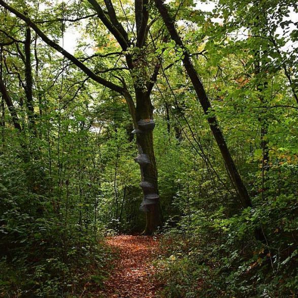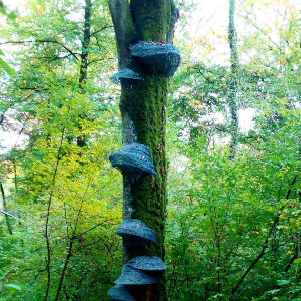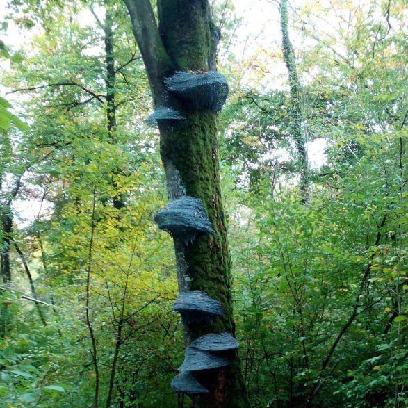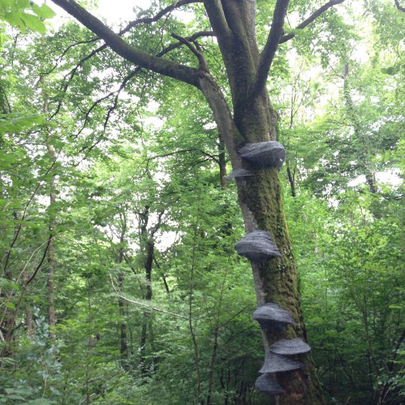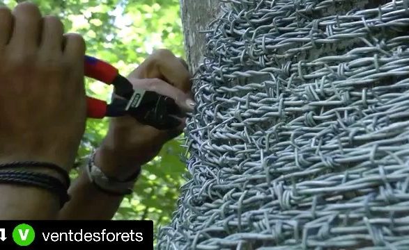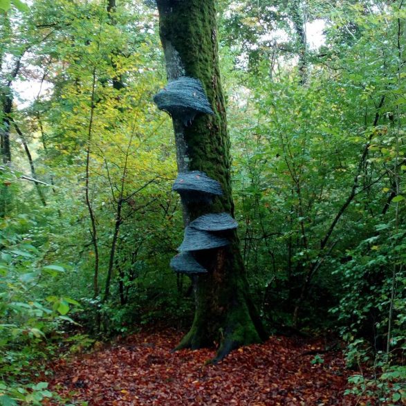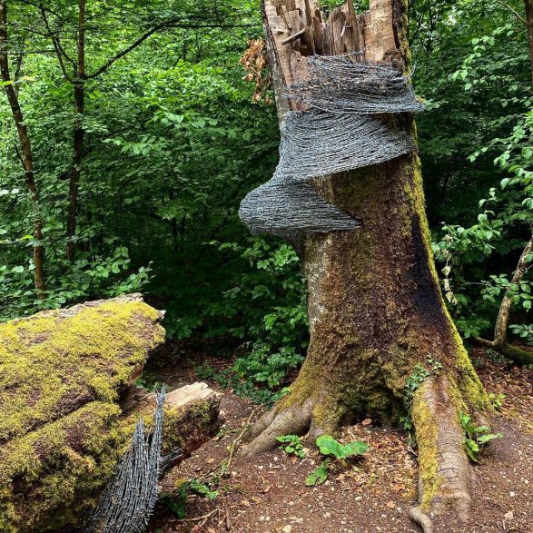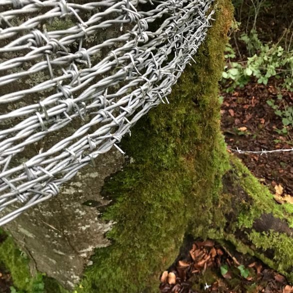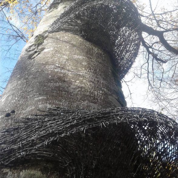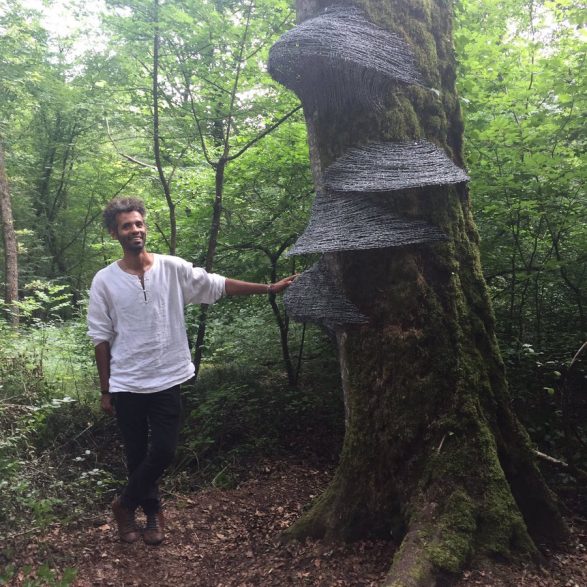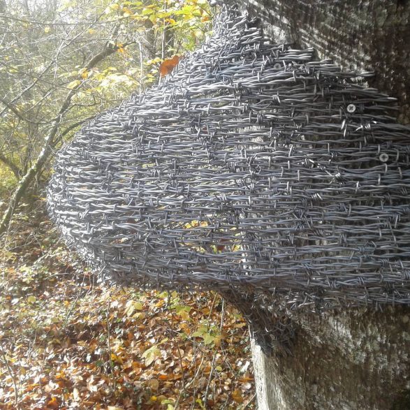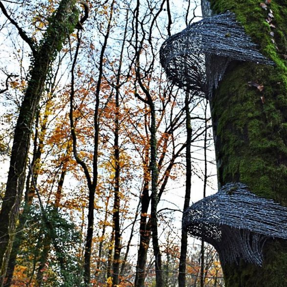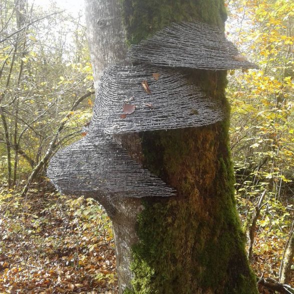 Abdul Rahman Katanani assemble le fil barbelé pour l’utiliser comme une toile rigide. Un matériau qu’il façonne ici sous la forme de polypores, ces gros champignons qui poussent sur les arbres morts. Sur le tronc d’un hêtre sont ainsi disposés ces symboles du cycle naturel : la décomposition de l’arbre nourrissant ses hôtes. Le fil de fer barbelé, très présent sur notre territoire rural, est aussi un matériau qui résonne différemment pour l’artiste qui a grandi dans le camp de réfugiés palestiniens de Sabra, au Liban.