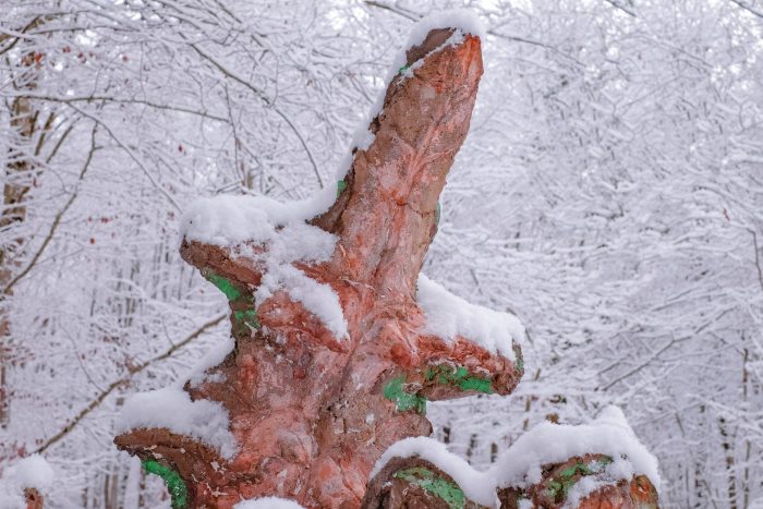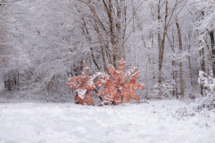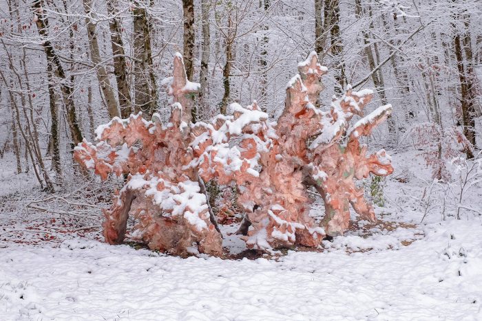 Installation de l'oeuvre Chardons ardents en forêt avec l'aide de l'entreprise TERA © Demian Letinois