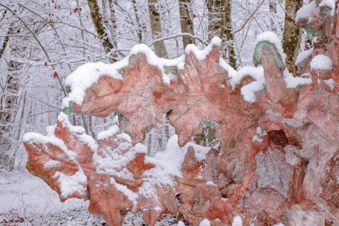 264Vincent Cardoso assemble et érige des feuilles de Chardon-Marie cueillies le long des sentiers. Il joue avec les détails si caractéristiques de la plante : bords découpés, courbes ondulées et nervures très marquées. Chaque sculpture procède d’un tirage unique grâce à la technique de fabrication d’un moule à ‘creux perdu’.