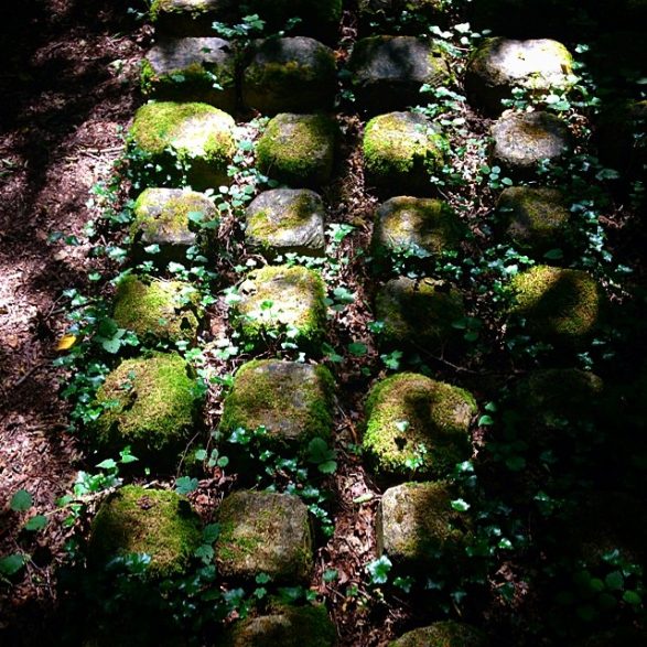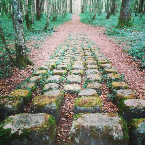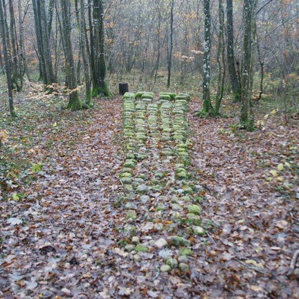 083Au bout d’une allée en forêt, Liliana de Vito crée un pavage de pierres calcaires blanches taillées. Alignées en ordre croissant, elles forment un chemin qui s’allonge et s’évase, créant un effet de perspective. Accompagnez ce chemin de vie et trouvez la pierre qui correspond à votre âge entre les deux extrêmes de la vie…