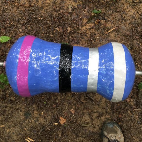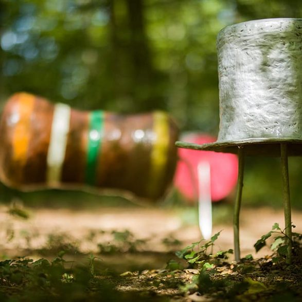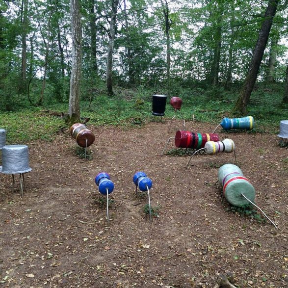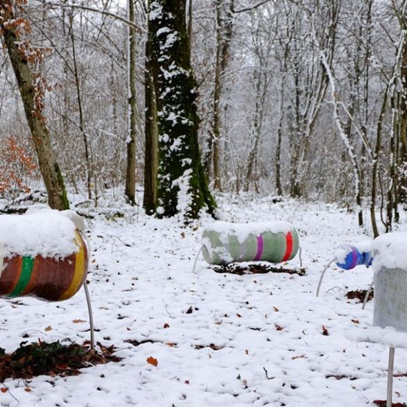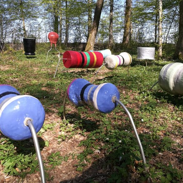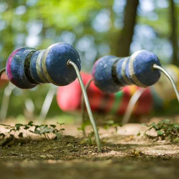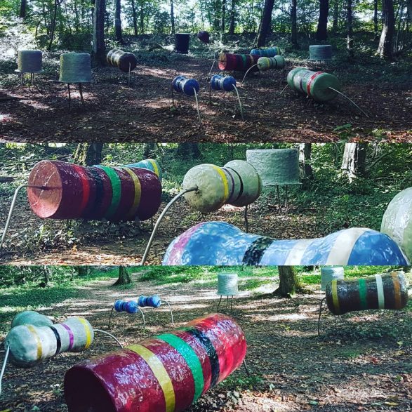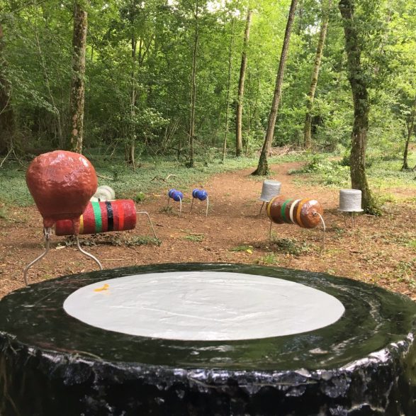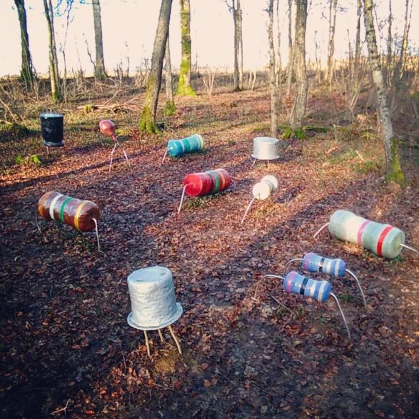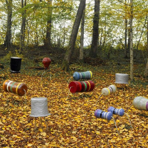 198Bevis Martin et Charlie Youle installent dans la forêt un ensemble de sculptures en grès émaillé aux formes de composants électroniques géants. Ils créent à quatre mains une scène colorée dont chaque pièce est née du plaisir du geste de façonner, de la fantaisie du jeu enfantin. L’échelle des objets propose un saut dans l’imaginaire ou dans la mémoire de leçons trop apprises. Le doute s’insinue entre la vision de formes encore indéterminées et la représentation d’un circuit imprimé captant les flux énergétiques du sol de la forêt.