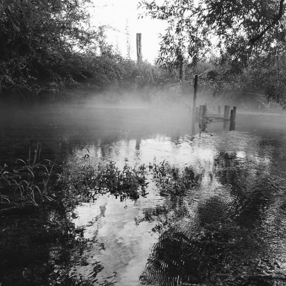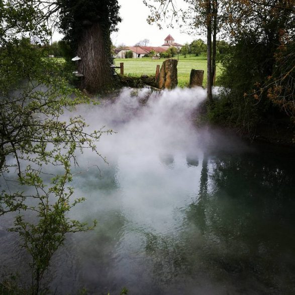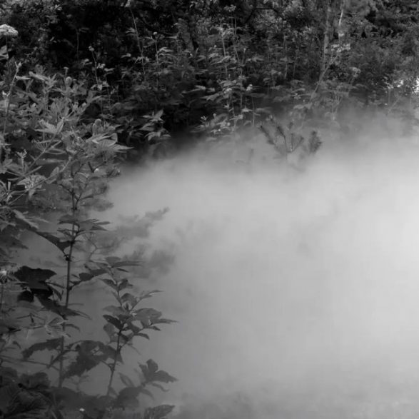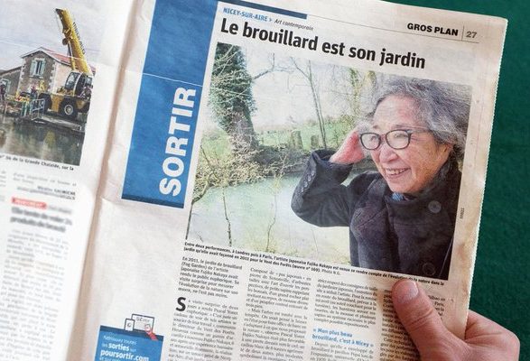 169Fujiko Nakaya compose une sculpture de brume à proximité du village de Nicey-sur-Aire, sur un terrain aménagé à la manière d’un jardin japonais. Les nappes de brouillard, déclenchées suivant une partition précise, montent des deux côtés de la rivière Aire, envahissent le jardin, le traversent, se dispersent ou s’installent selon le vent, et façonnent un paysage toujours différent. Un petit chemin de copeaux et de gravier blanc mène à l’espace habité de pins, de bambous, de mousse, de plantes et de larges blocs de pierre locales, écrin d’une œuvre qui incite à la contemplation et à la conscience de la nature.