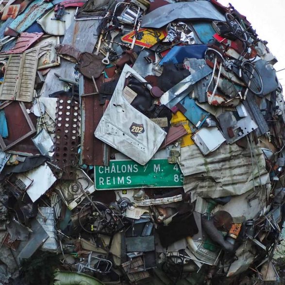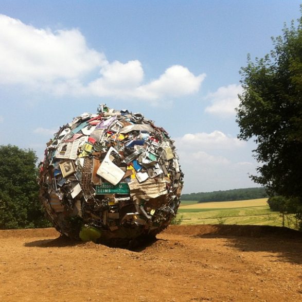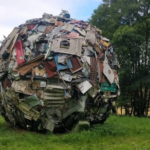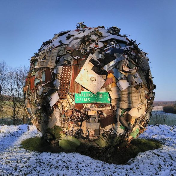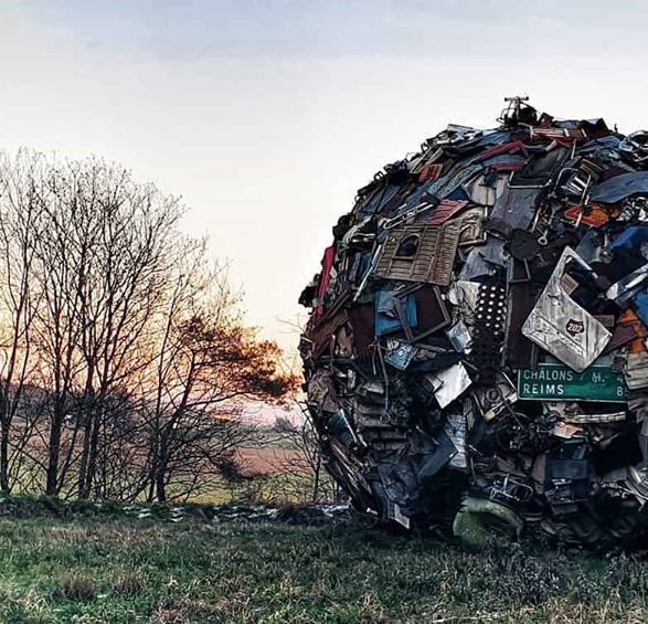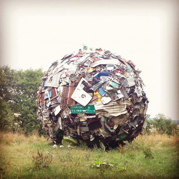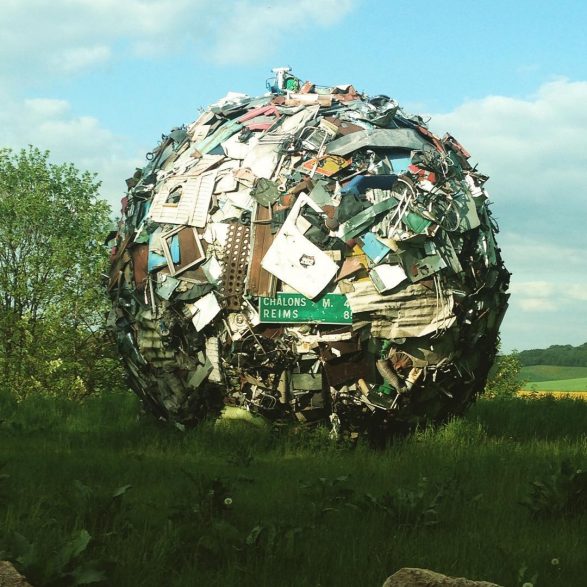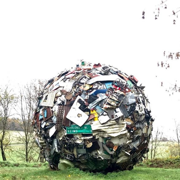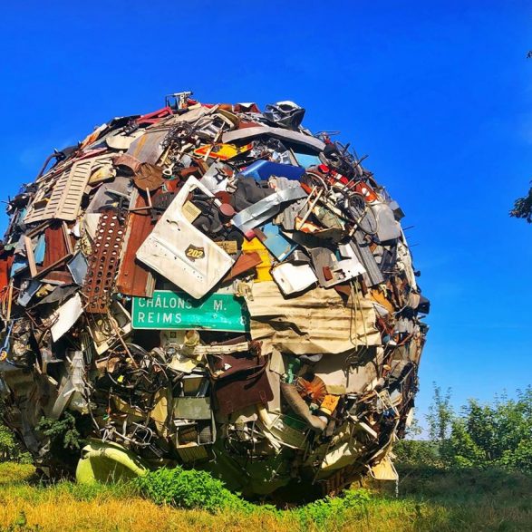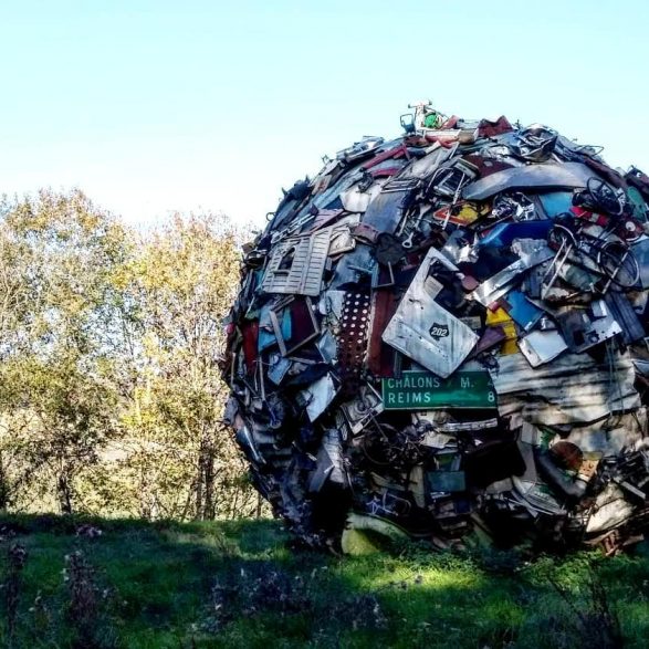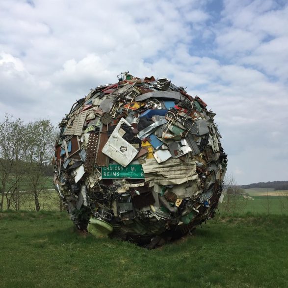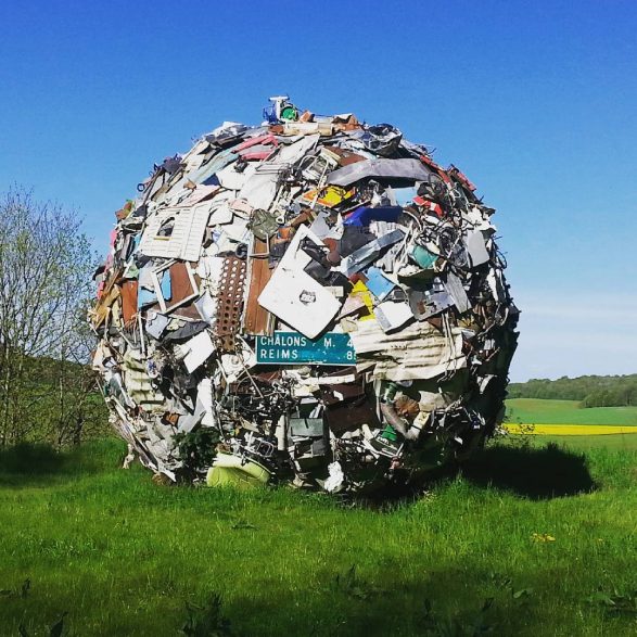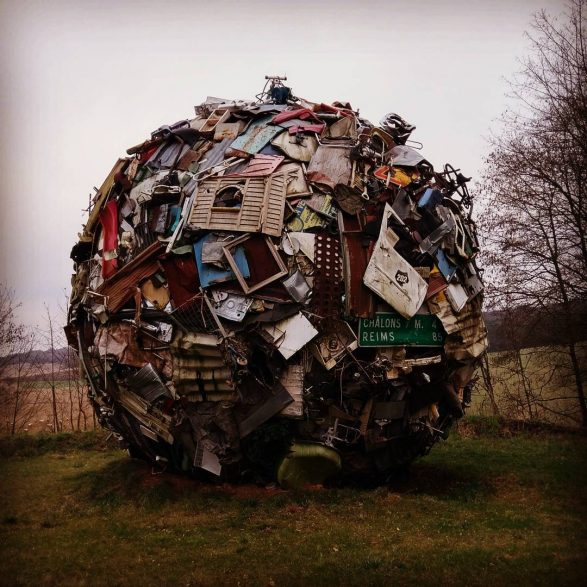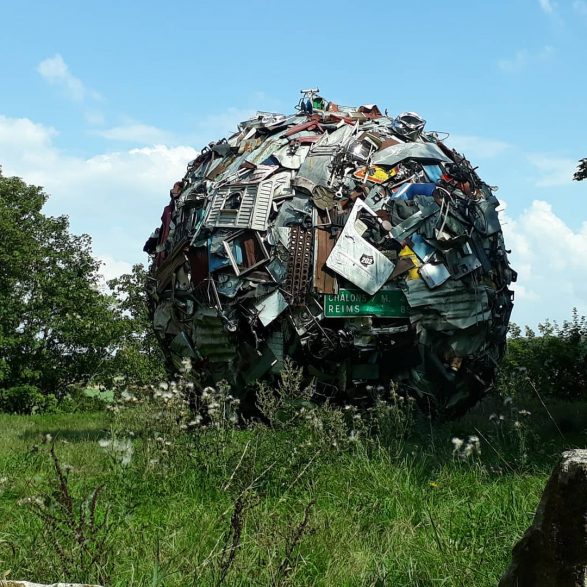 184Maarten Vanden Eynde agrège sur le site d’un ancien dépotoir de village les rebuts de notre société de consommation en une sphère géante. Stoppée dans sa course, cette masse d’objets ayant appartenu aux familles du territoire, s’érige en effigie stupéfiante de notre société moderne. Cette sculpture explicite les enjeux écologiques contemporains et agit comme un miroir grossissant des menaces encore mésestimées qui pèsent sur une nature fragile.
