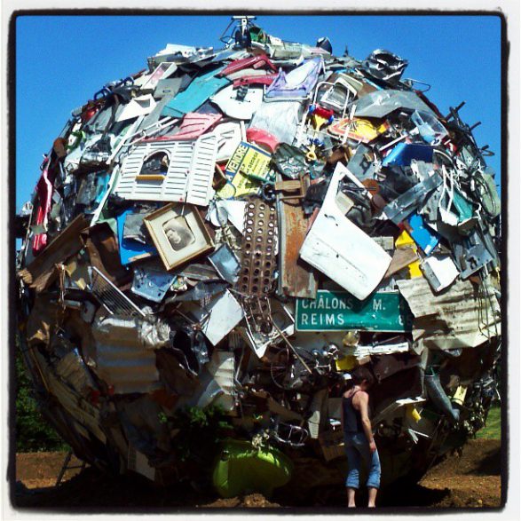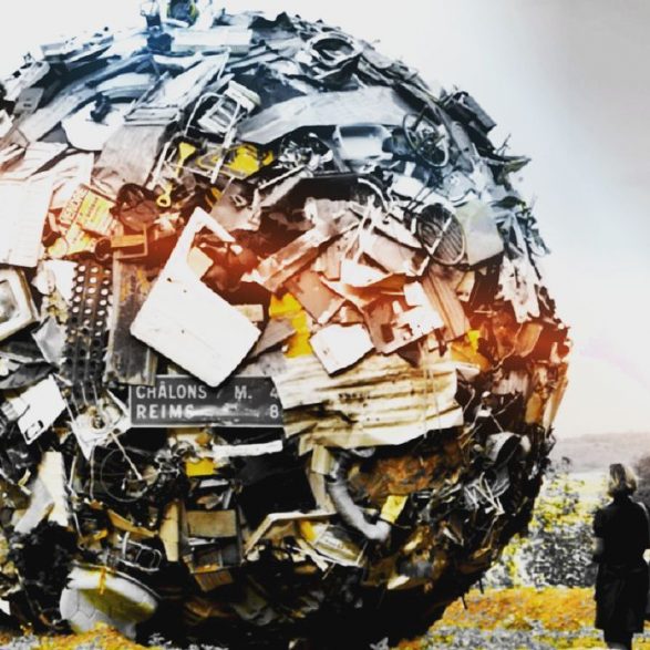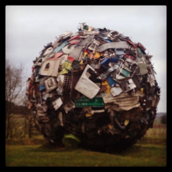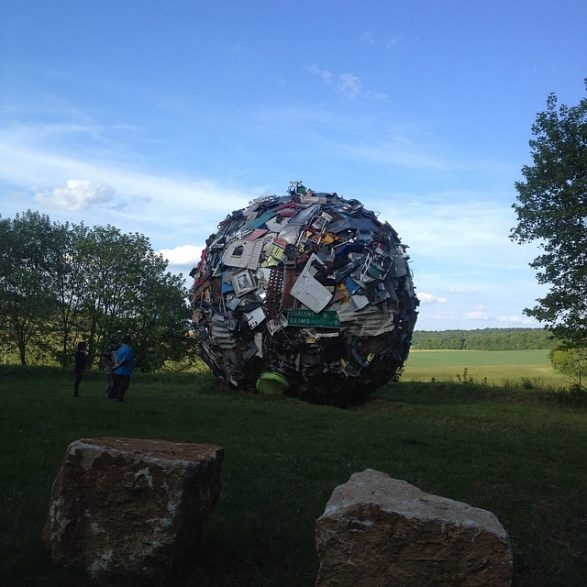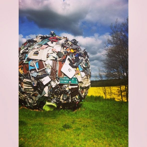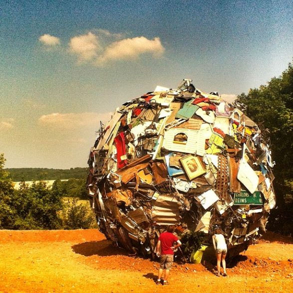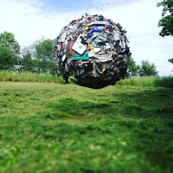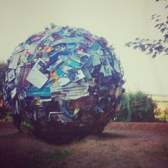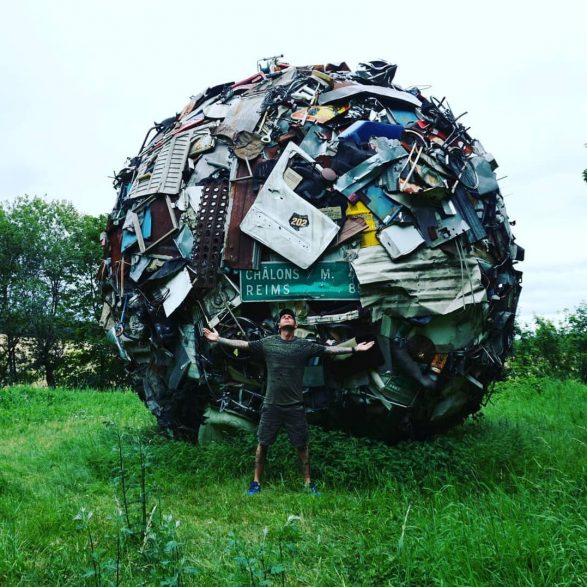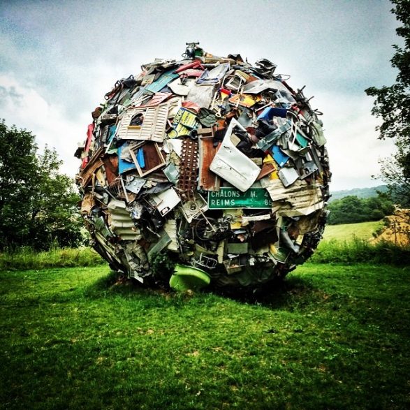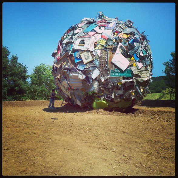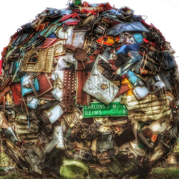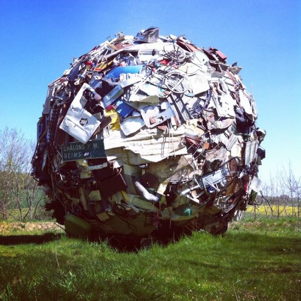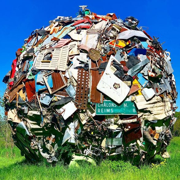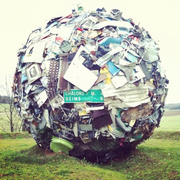 184Maarten Vanden Eynde agrège sur le site d’un ancien dépotoir de village les rebuts de notre société de consommation en une sphère géante. Stoppée dans sa course, cette masse d’objets ayant appartenu aux familles du territoire, s’érige en effigie stupéfiante de notre société moderne. Cette sculpture explicite les enjeux écologiques contemporains et agit comme un miroir grossissant des menaces encore mésestimées qui pèsent sur une nature fragile.