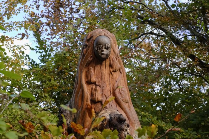 262A partir d’un chêne, Léon Binétruy crée trois ruches tronc pour accueillir en lisière de forêt des colonies d’abeilles sauvages. Elles représentent trois madones parées de symboles sculptés : des cellules royales sur les visages, des grenouilles le long des corps et des chevelures serpentines.