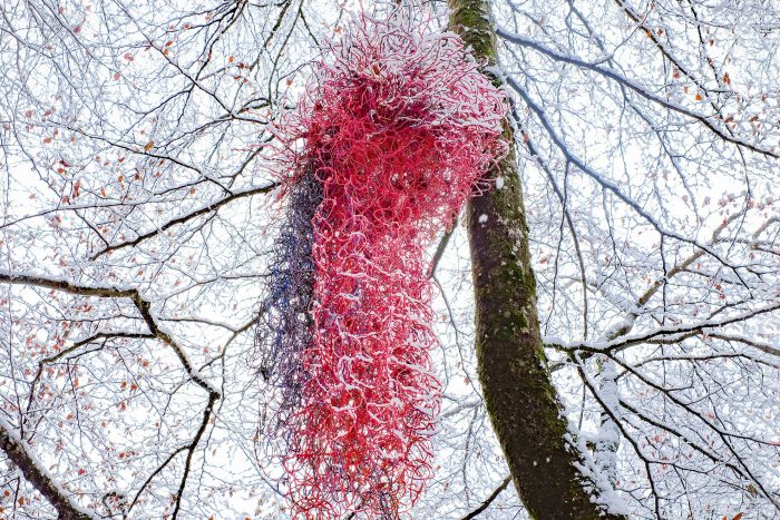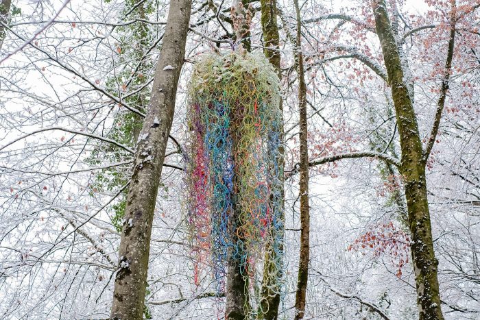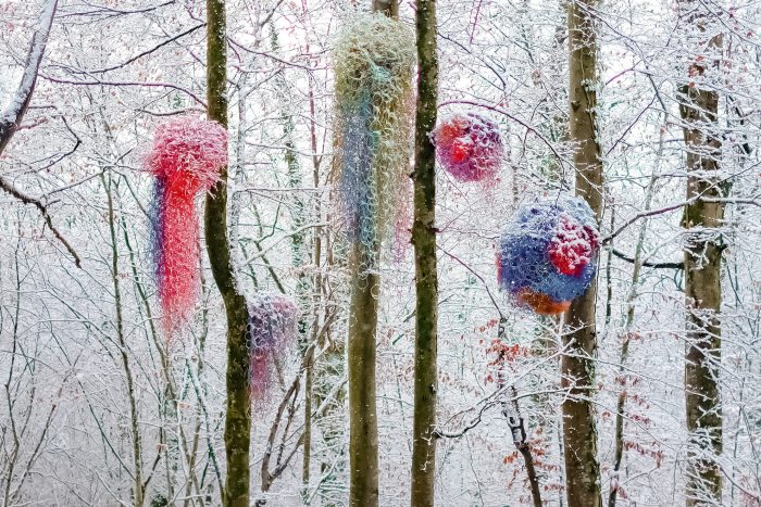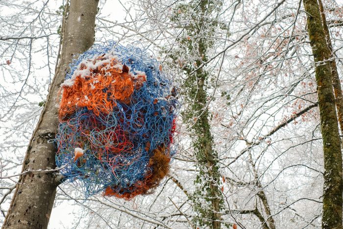 Sensible aux sources d’énergies présentes en forêt, Masami entrelace ici des fils métalliques gainés de couleurs, un matériau de réemploi qui prend ici la forme de cinq sculptures souples et organiques, disposées telles des fruits, des nids, des cocons ou des chancres.