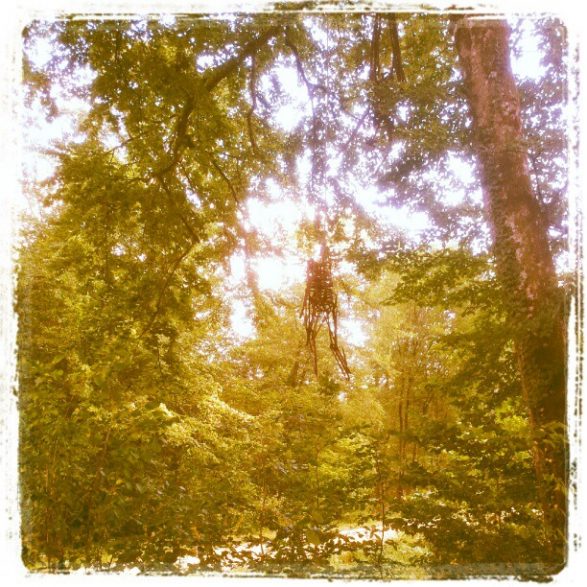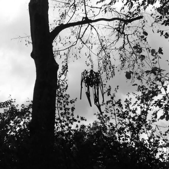 096Emmanuel Perrin suspend douze squelettes désarticulés à de hauts branchages à la croisée de deux chemins. Animés par le vent, altérés par les intempéries, ces pendus métalliques couverts de rouille évoquent une danse macabre, une destinée tragique illustrée par le graveur nancéien du XVème siècle Jacques Callot et le poète François Villon dans sa Ballade des pendus.