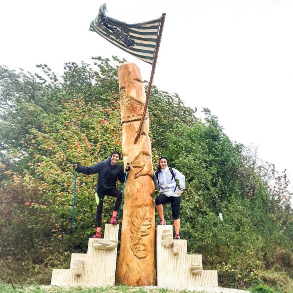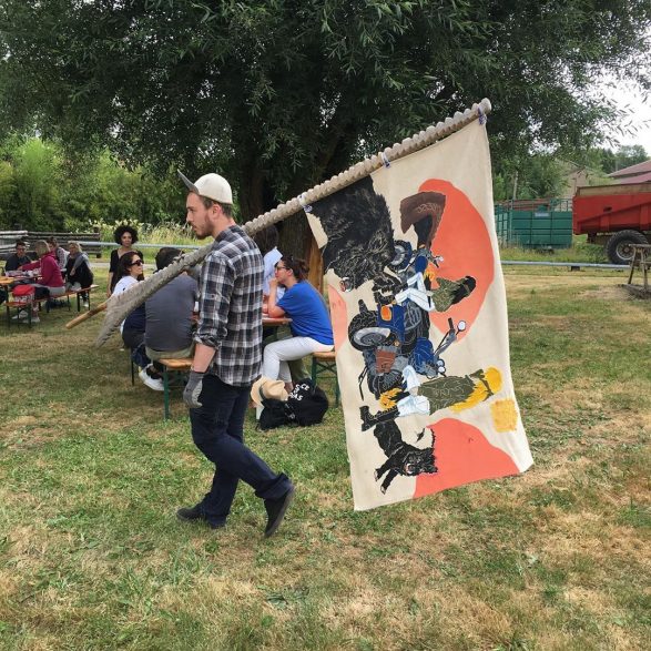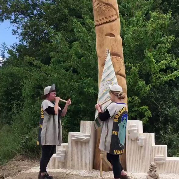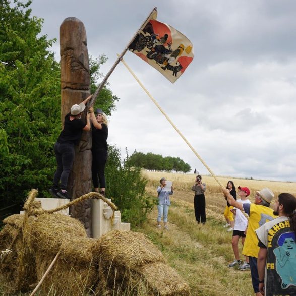 215Aurélie Ferruel et Florentine Guédon nous convient à un rituel festif autour d’une sculpture-totem en bois et pierre de taille. Elles réalisent à quatre mains deux escaliers ornés de champignons qui encadrent un grand mât de chêne sculpté par Aurélie Ferruel. Une performance partagée avec le public présent inaugure la pièce tout près du village de Lahaymeix. Costumée et chantée, cette parade donne vie à l’œuvre qu’elles viennent solennellement parer d’un étendard brodé par Florentine Guédon. Créé pour l’occasion, il sera renouvelé au fil des années. Les motifs des vêtements de fête et du drapeau s’inspirent à la fois de la céramique précolombienne et de l’univers visuel des bikers. Quant à ceux des décors sculptés et des bruitages de la fête, ils font référence à l’univers cynégétique.