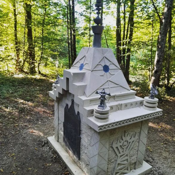 241Sur le circuit du Gros Charme, Antoine Liebaert fabrique un édifice fantastique qui puise ses inspirations dans les cultures populaires du monde entier, traversant les époques et mixant les croyances les plus ésotériques avec une technologie élémentaire. Une grande variété de motifs et d’entités coulés en aluminium et en verre sanctifient de façon joyeuse ce petit ouvrage en maçonnerie composite. L’ensemble est susceptible de connecter, avec humour et par le biais d’une antenne, le promeneur avec les grandes forces de l’univers.