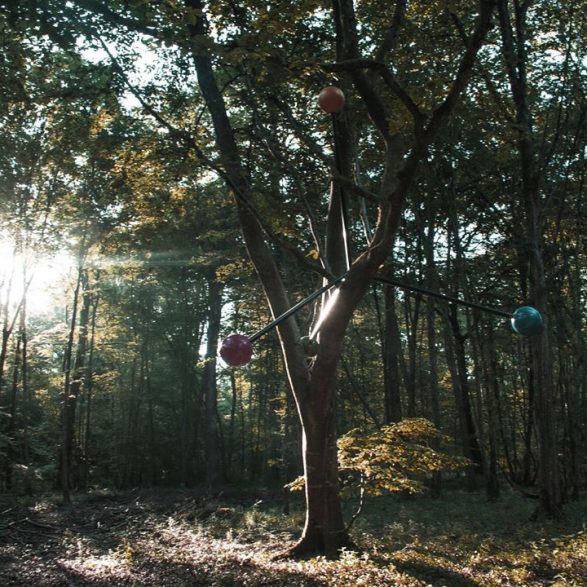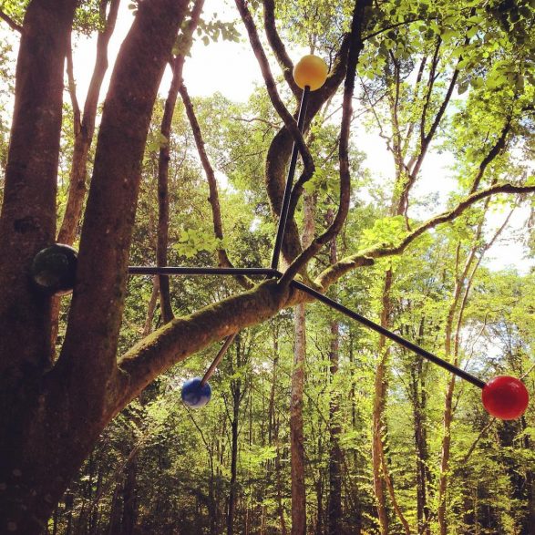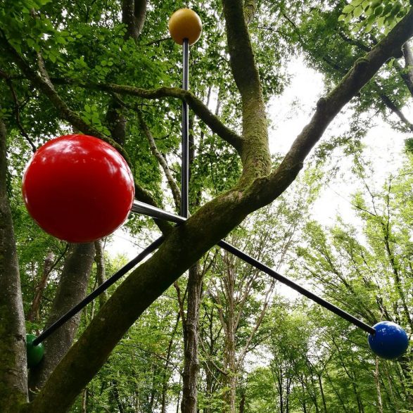 163Evariste Richer emprunte sa logique à la cartographie et au « théorème des quatre couleurs ». Avec La molécule du territoire, il colore symboliquement les terrains du cadastre sans que deux couleurs identiques ne se juxtaposent. Le quadripode en équilibre se situe à la croisée de plusieurs parcelles et interroge ainsi la notion de frontière et les usages du territoire.