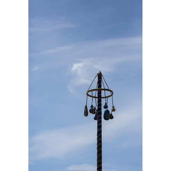 125Jean-François Chevalier dresse le mât de cocagne isolé en bordure de la route de Pierrefitte-sur-Aire. Cette attraction des fêtes de village d’autrefois est entièrement recouverte de bris de verre qui la rendent impraticable. Ce totem d’une époque révolue marie la subtilité des éclats colorés à la rudesse, l’archaïsme du support, et traduit une nostalgie, comme un désenchantement.