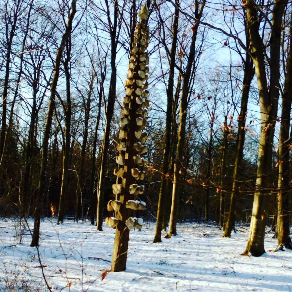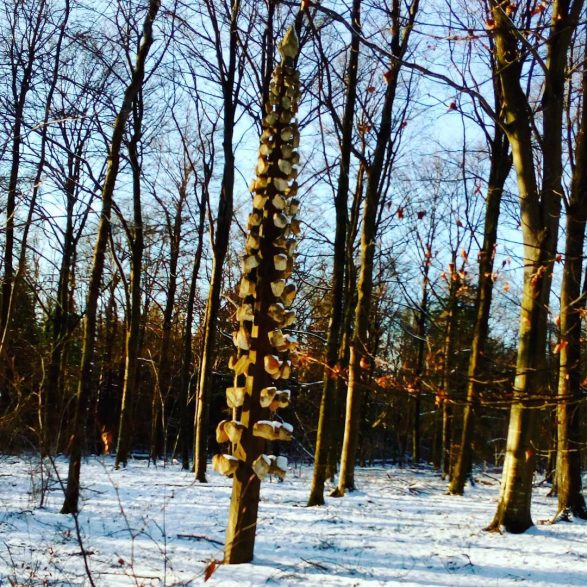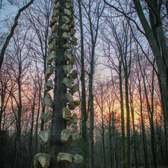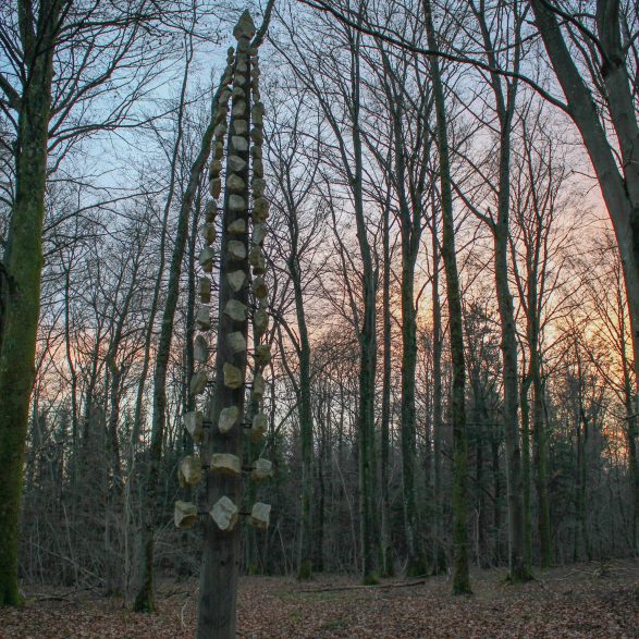 033Kazys Venclovas dresse dans la forêt un tronc écorcé et garni de pierres blanches au bout de tiges de métal. Cet étonnant Sapin aux feuilles de pierre résiste au temps et semble convier les promeneurs à une ronde joyeuse dans l’ombre des sous-bois. Totem de la convivialité, il est le témoin des réjouissances des hommes et de la vitalité de la nature environnante.