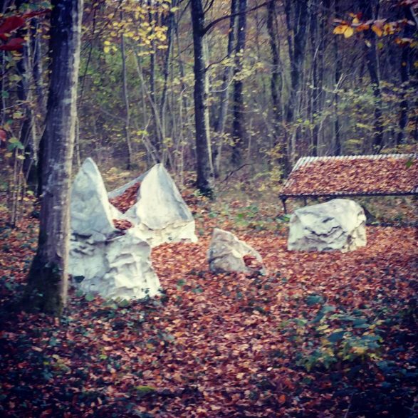 Autour de l'œuvre, entre les nombreux charmes, un hêtre au tronc moussu et deux grands érables champêtres surplombent un dense tapis herbacé avec parisette-raisin-de-renard, anémone sylvie et muguet, tous toxiques, mêlés à l’abondante laîche des bois, rude au toucher.