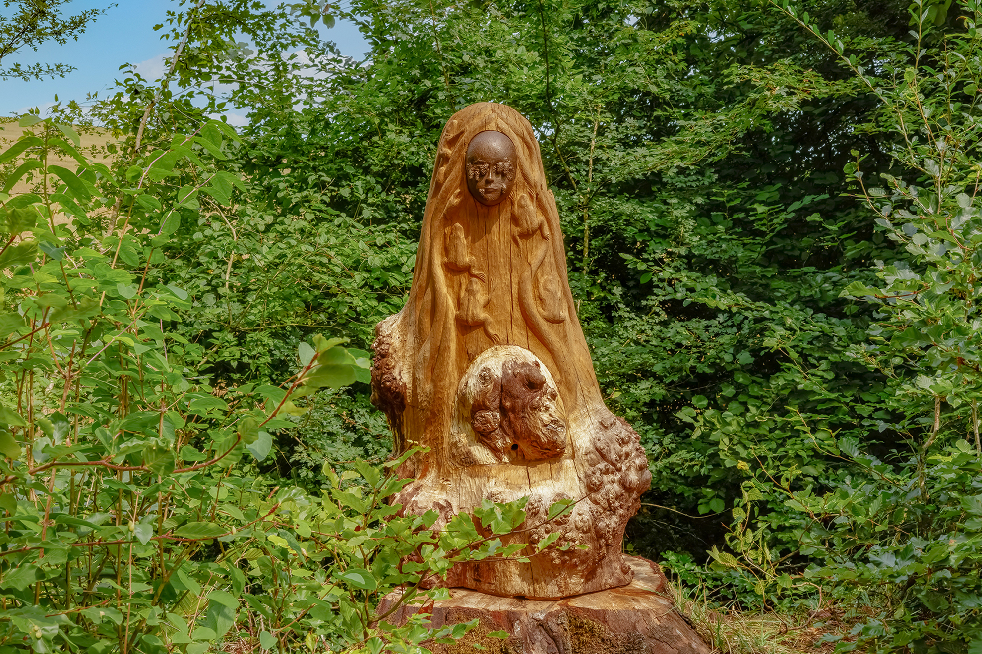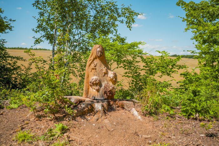 262A partir d’un chêne, Léon Binétruy crée trois ruches tronc pour accueillir en lisière de forêt des colonies d’abeilles sauvages. Elles représentent trois madones parées de symboles sculptés : des cellules royales sur les visages, des grenouilles le long des corps et des chevelures serpentines.