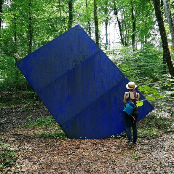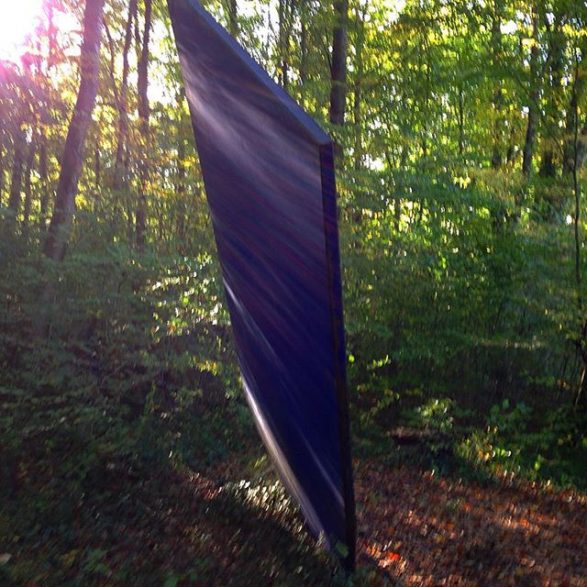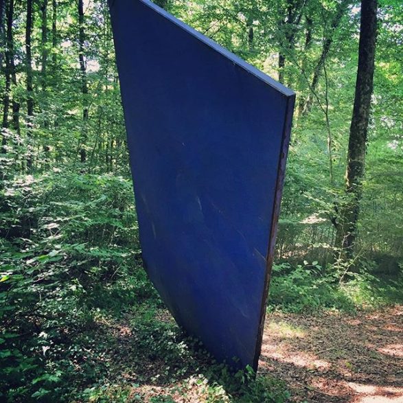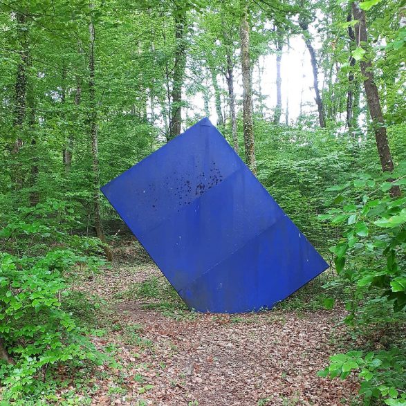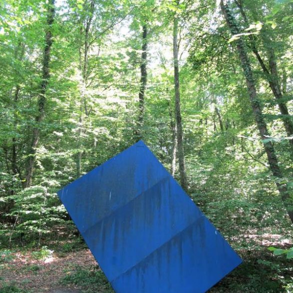 066Cette pièce rectangulaire bleu outremer, fichée dans le sol par Denis Malbos, fait partie d’un vaste projet nommé Les cent ciels plantés, dispersés à travers le monde aussi bien dans la nature qu’en ville. Les proportions de ces ciels monochromes sont basées sur le nombre d’or auquel est associée l’idée de perfection esthétique et d’équilibre, que l’on retrouve dans l’architecture antique grecque, celle de Le Corbusier ou l’œuvre de Leonard de Vinci. L’artiste cherche à lire dans ces éléments, comme découpés du paysage, des présages divins.