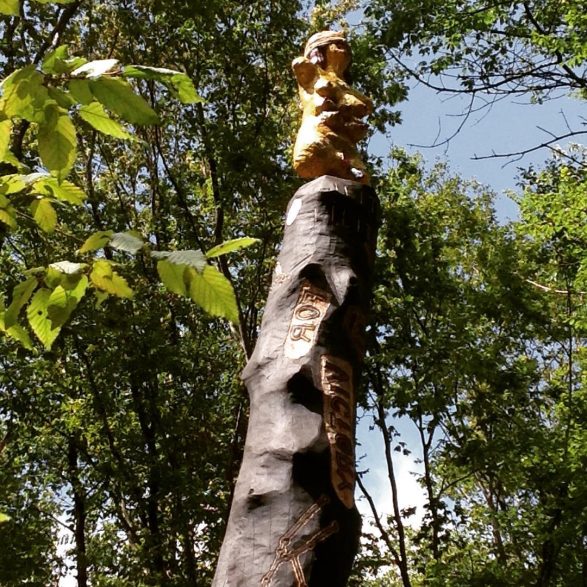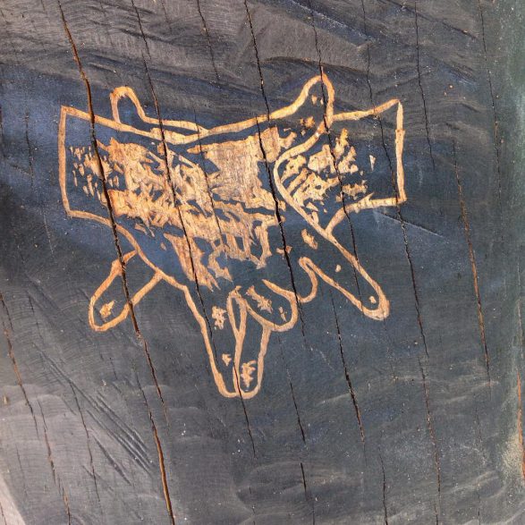 193Damien Deroubaix grave à la gouge le tronc d’un chêne encore sur pied, encré de noir, d’où émergent en négatif un ensemble de motifs et de sentences énigmatiques. Squelette, constellations, mot en langue arabe et haïkus en morse martèlent cette colonne crépusculaire. La déesse hermaphrodite aux seins multiples érigée au sommet et le titre de l’œuvre convoquent Lilith, personnage mythologique qui cristallise, dans la culture judéo-chrétienne, les angoisses d’un monde ténébreux et désespéré.