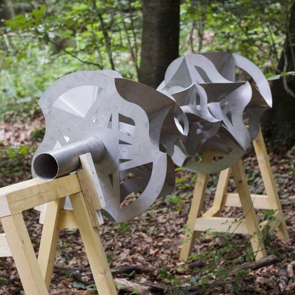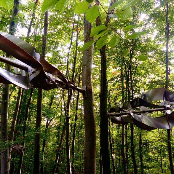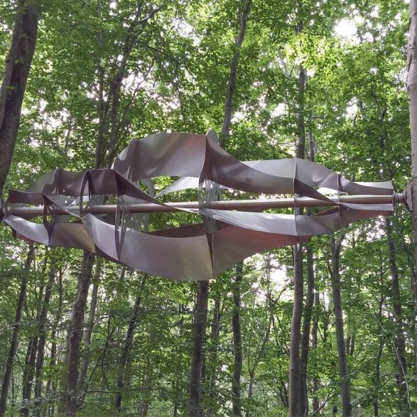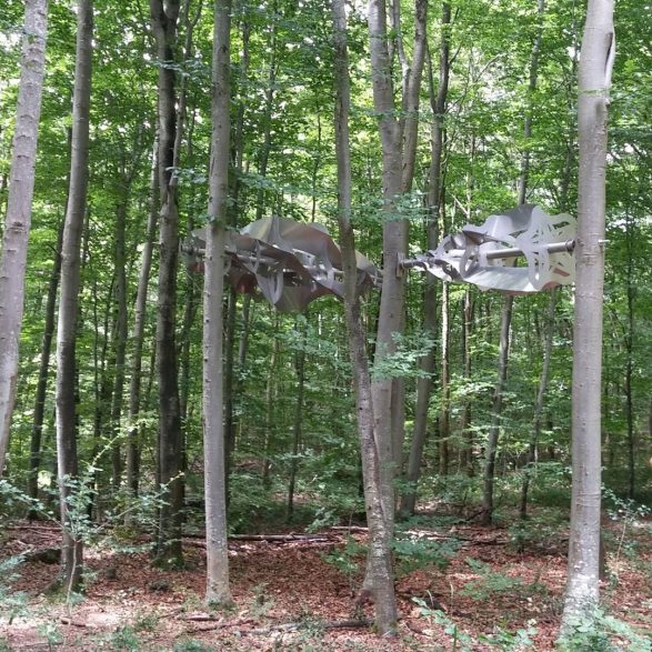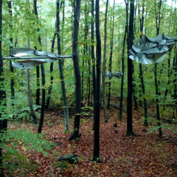 203Matthieu Pilaud suspend entre six arbres trois formes hélicoïdales en inox. Chacune comporte de six à huit sections qui s’inscrivent visuellement dans un pentagone. Décliné à plusieurs échelles, ce motif se multiplie à l’infini dans une mise en abîme, devient hypnotique. Les découpes intérieures du métal permettent d’entrevoir des étoiles en négatif. Ces pièces qui convoquent les mathématiques offrent une expérience sensible née de l’alchimie des formes parfaites.