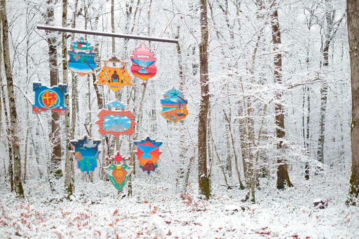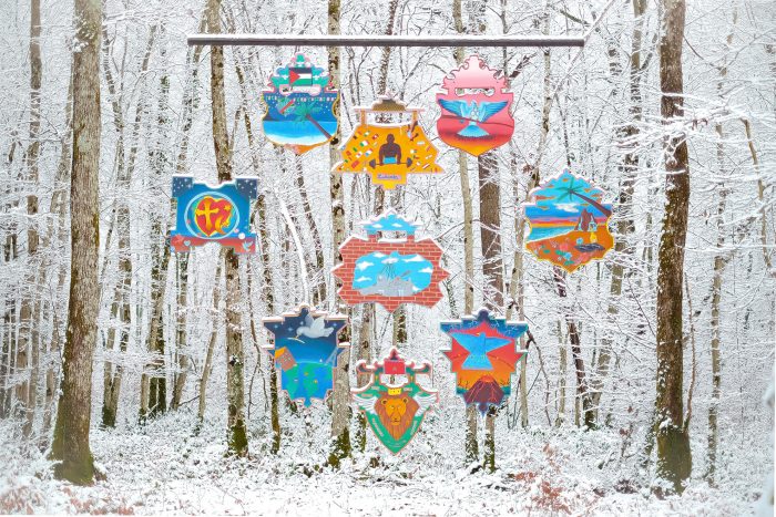 263Julien Marmar propose une installation composée de neuf tableaux suspendus entre deux arbres, inspirés des enseignes médiévales. Cette œuvre collective a été réalisée avec six détenus volontaires du centre de détention de Saint-Mihiel. Chaque détenu a représenté un vœu, un souhait ou un rêve, dans lequel le motif de l’oiseau est récurrent. Colombes, phœnix ou pigeons, ils symbolisent le renouveau, la paix, la liberté ou la transmission de messages.