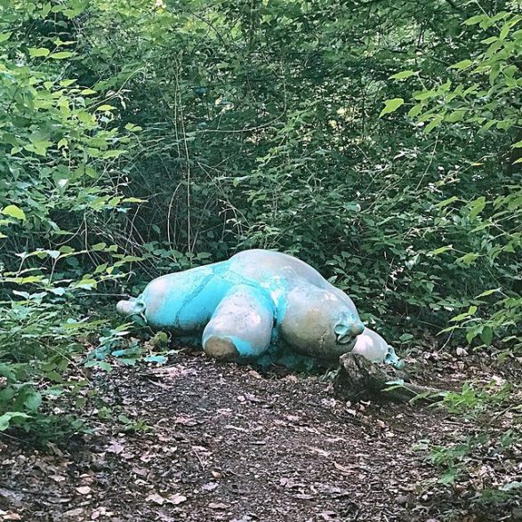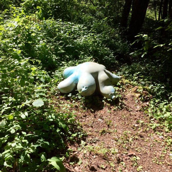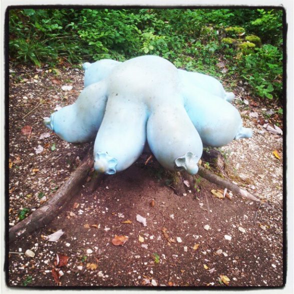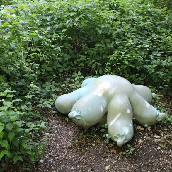 157Miss Panoramique veille, et offre au regard ses multiples mamelles nourricières et ses formes bleues équivoques. Elsa Sahal crée une sculpture hybridant le végétal, l’animal et l’humain à la fois joyeuse et vaguement inquiétante. Plein de fantaisie et de connotations sexuelles, le travail de l’artiste déclenche le trouble autant que le plaisir et libère les représentations du corps des carcans habituels.