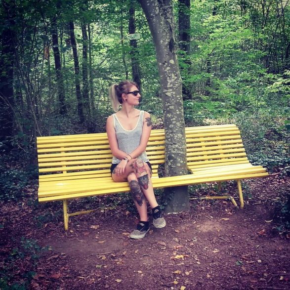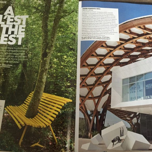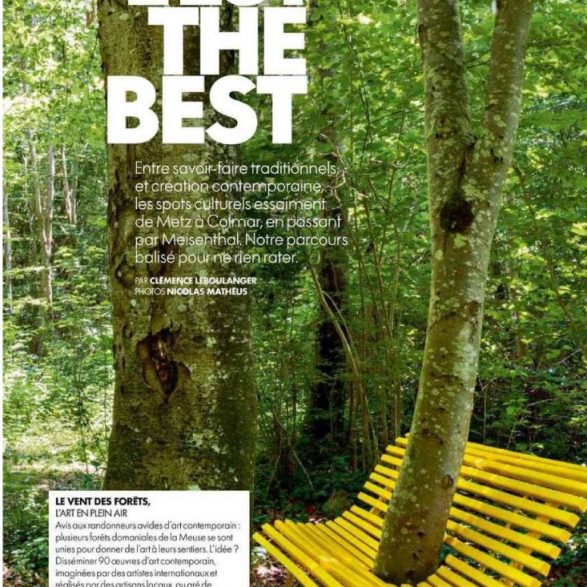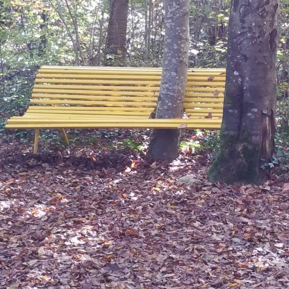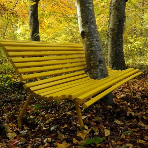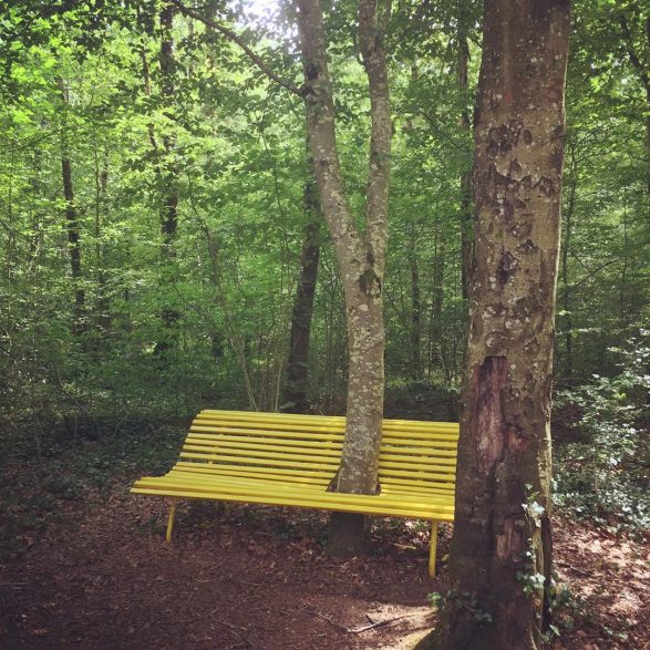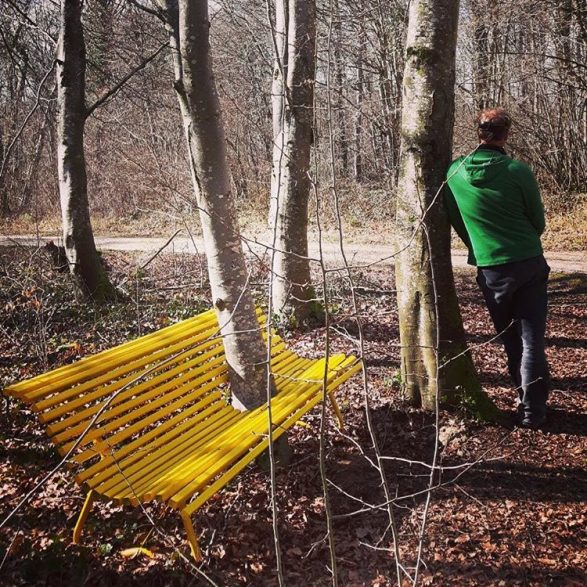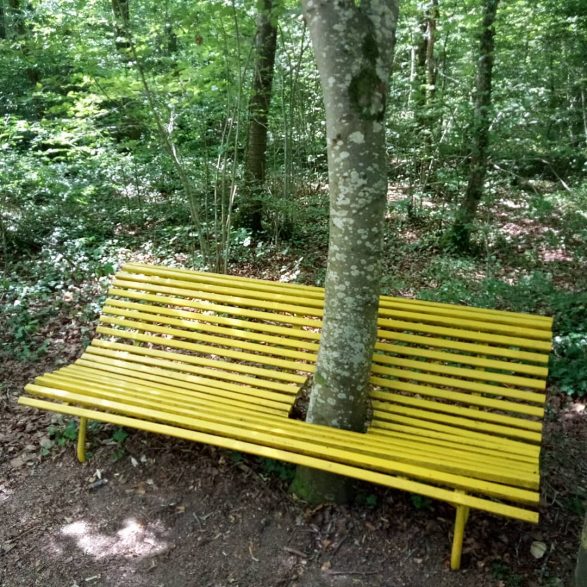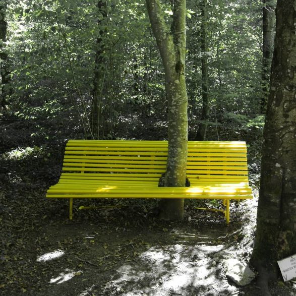 004Patrick Demazeau (dit Made) crée un dialogue tangible entre un banc public et le hêtre qui traverse son assise. Invité à faire une halte le promeneur se trouve au plus près de ce qu’il vient observer, un arbre avec lequel il peut converser en toute intimité. L’imbrication des deux éléments, à la fois simple et absurde, évoque l’escapade d’un mobilier urbain en quête d’espace sauvage et un arbre en liberté que la ville n’arrête pas.