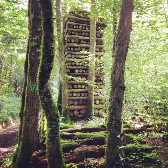 021Stéphanie Buttier et Françoise Crémel construisent un tas de bois démesuré, un stère gigantesque qui s’élève entre les arbres de la forêt. Les proportions inhabituelles de cet amoncèlement de rondins parfaitement rangés obstruent la vue, le passage, et rendent leur utilisation impossible. Cette construction évoque à la fois le labeur, terrestre, parfois vain, et les aspirations de l’homme à s’élever vers les hauteurs, peut-être jusqu’au ciel.