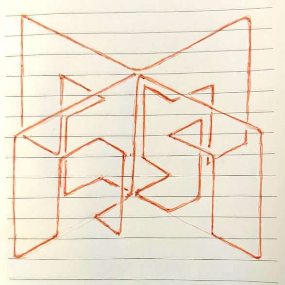 239Marin Kasimir dessine One Line, « une seule ligne ininterrompue de 69 m, 36 fois pliée régulièrement et perpendiculairement dans l’espace ». Géométrique, cette sculpture de 3,20 m de haut suggère des murs, un sol, des portes ouvertes.. Le regard perçoit d’abord le tracé du métal sur le sol blanc, puis se trouble à mi-hauteur, découvrant le fil du trait devenu blanc sur le fond forestier. Les dimensions, les proportions et l’inscription dans le décor naturel invitent le promeneur à investir l’œuvre en en faisant l’expérience physique.