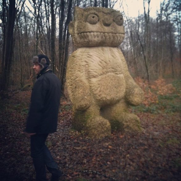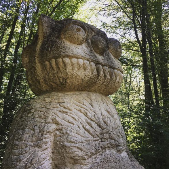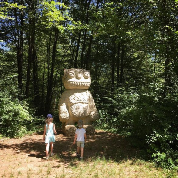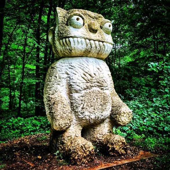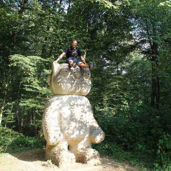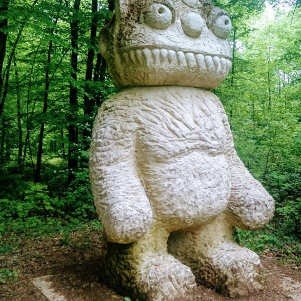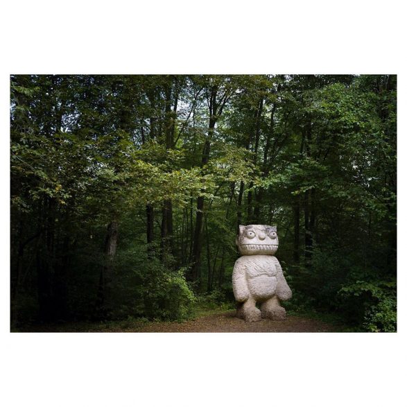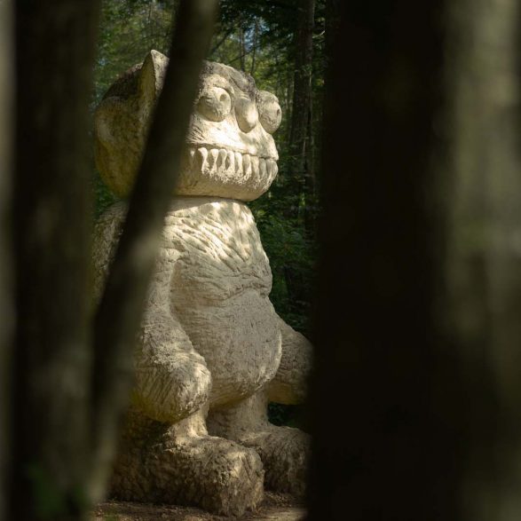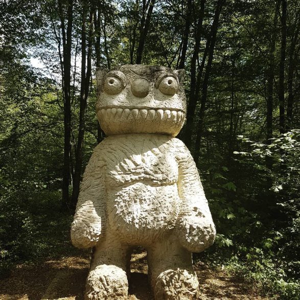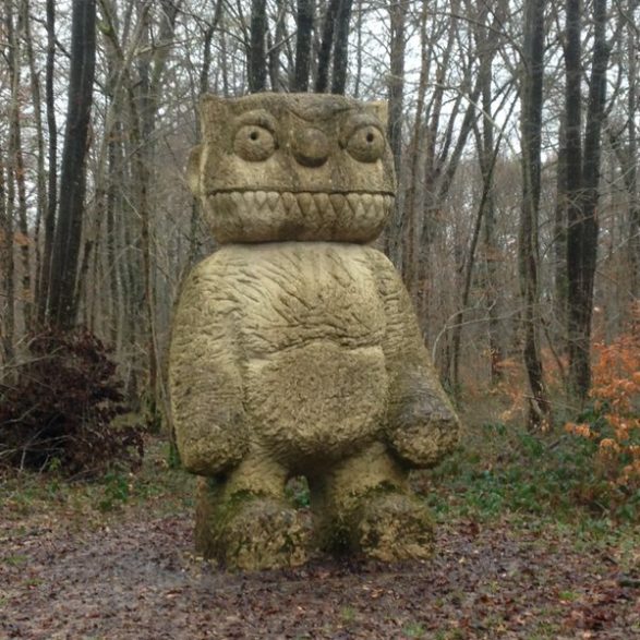164Stefan Rinck sculpte un colosse de trois mètres de haut aux dents acérées. Ce géant pétrifié en pierre de Savonnières trône dans les bois proche de Lahaymeix. Comme sorti d’un imaginaire enfantin, ce monstre immobile apprivoise les angoisses infantiles et devient un énorme jouet familier et rassurant. Cette statue inoffensive et protectrice incarne alors pour tous « l’ami de la forêt ».