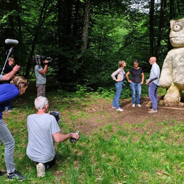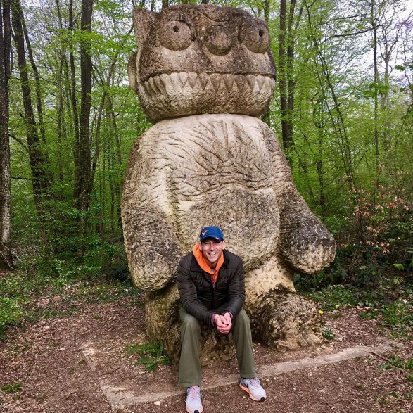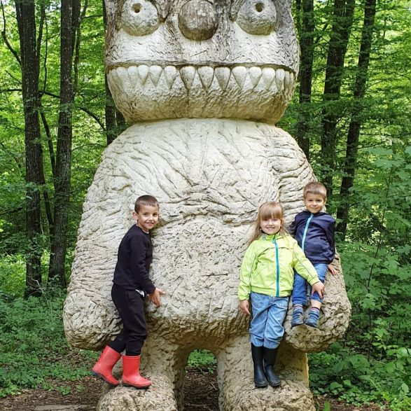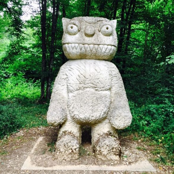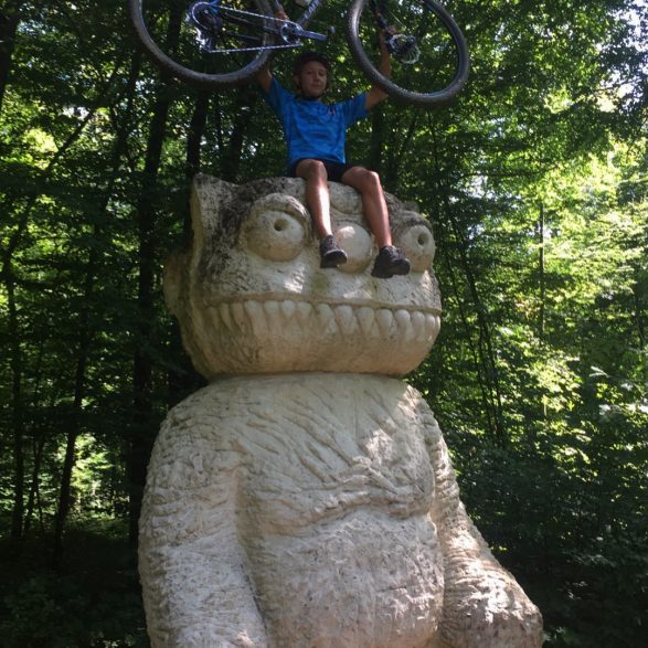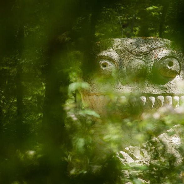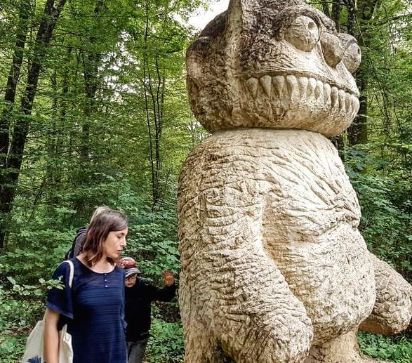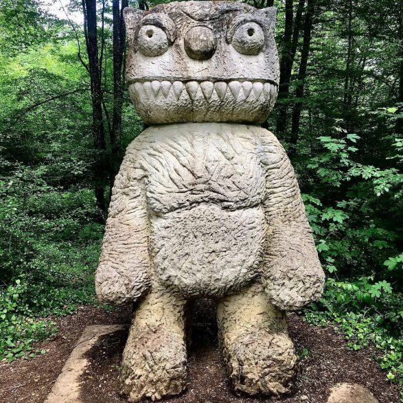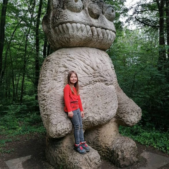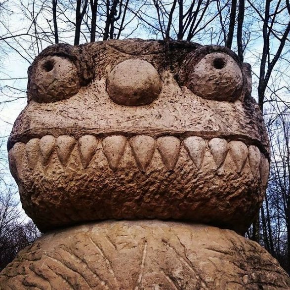 164Stefan Rinck sculpte un colosse de trois mètres de haut aux dents acérées. Ce géant pétrifié en pierre de Savonnières trône dans les bois proche de Lahaymeix. Comme sorti d’un imaginaire enfantin, ce monstre immobile apprivoise les angoisses infantiles et devient un énorme jouet familier et rassurant. Cette statue inoffensive et protectrice incarne alors pour tous « l’ami de la forêt ».