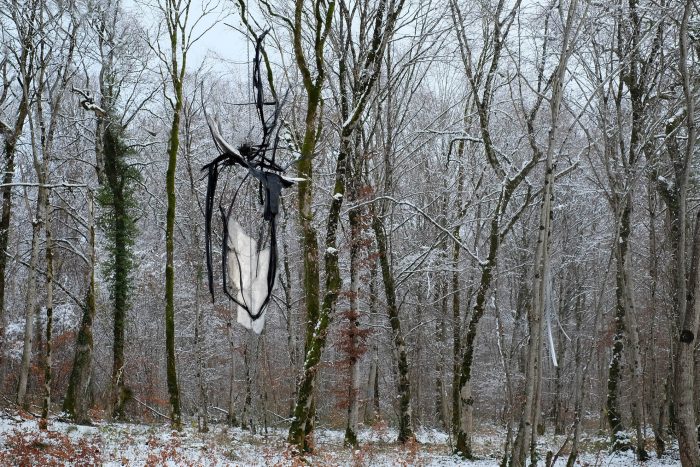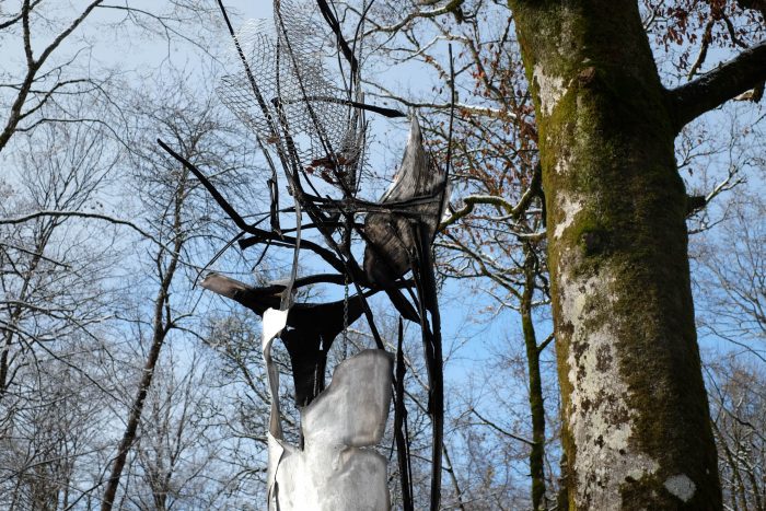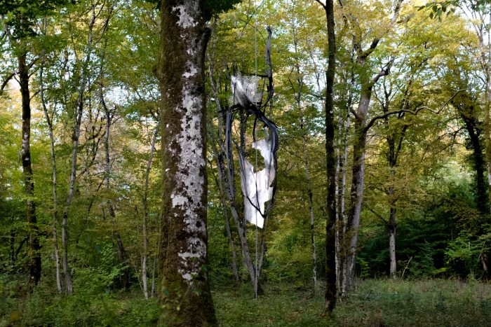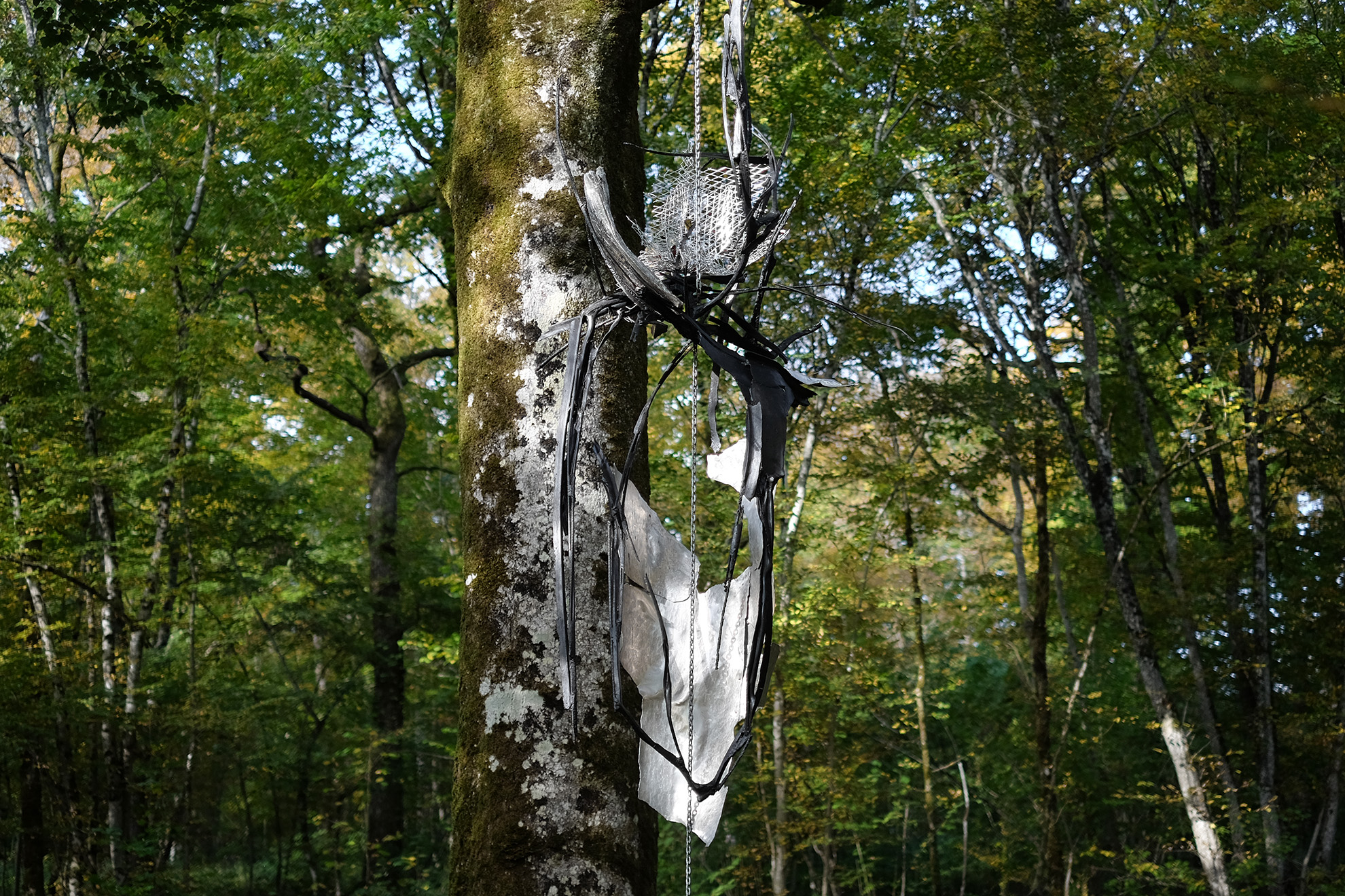265Autour d’un hêtre, Pauline de Fontgalland compose trois sculptures avec des chutes de métaux collectés, qu’elle a façonnées à l’aide d’une forge et ajustées les unes aux autres avec équilibre et légèreté. « Le titre évoque l’écriture d’un mouvement, la trace de tous les gestes accumulés pour faire sculpture comme un corps se tient debout. Il fait écho au rythme et à la déambulation, entre vide et apparition, au fil de deux sculptures en aluminium qui viennent, en bordure de sentier, répondre à la pièce principale ».