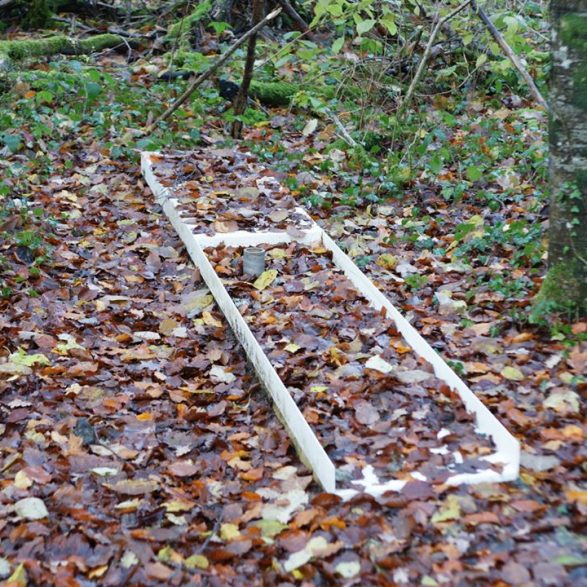 111Nicolas Schneider sonde la forêt à la recherche de rivières souterraines, avec les compétences d’un sourcier. L’eau, toujours au centre de ses préoccupations artistiques, est ici évoquée par la représentation de sa captation à la source et de sa rétention dans un abreuvoir stylisé. L’œuvre nous signale ainsi la richesse silencieuse du sol et sa possible exploitation.
