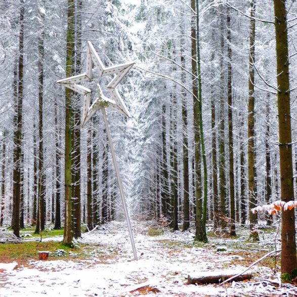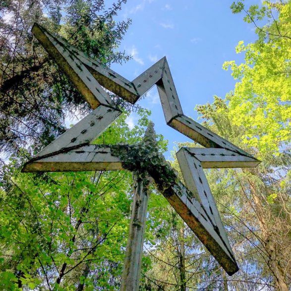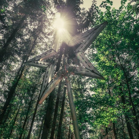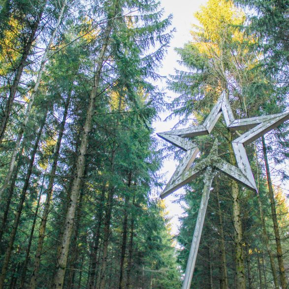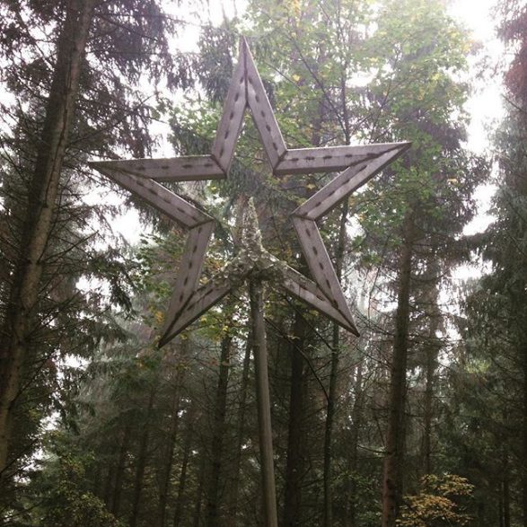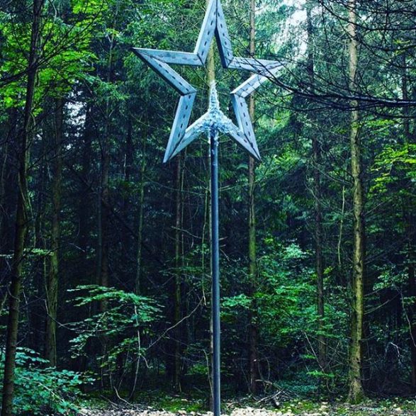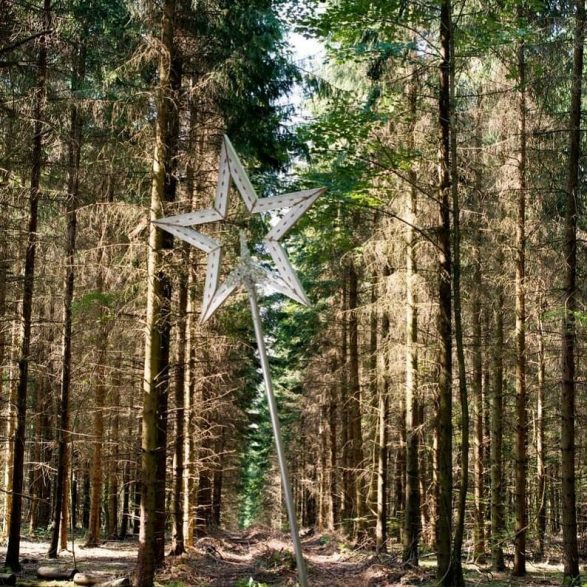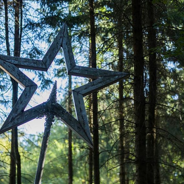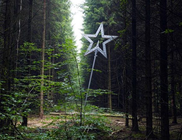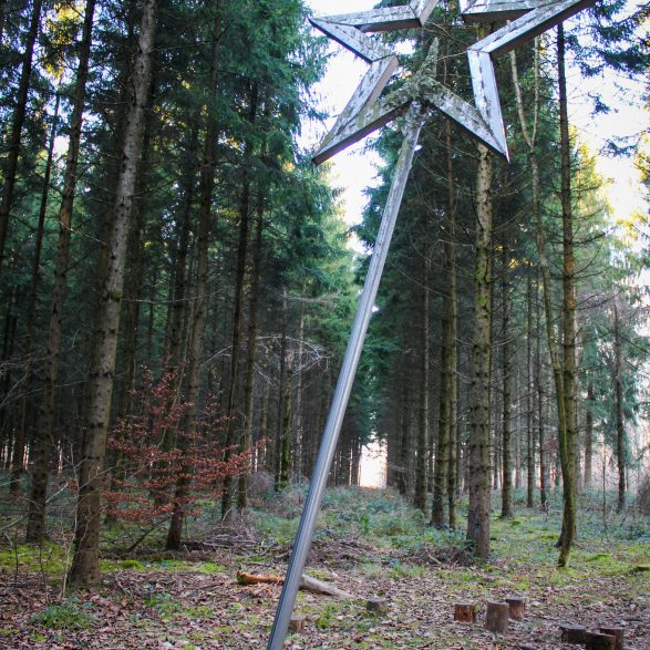 165Jean-Luc Verna plante une baguette magique monumentale dans le sol d’une sapinière pour réenchanter une région marquée par l’histoire, la guerre et l’exode. L’inclinaison de l’œuvre qui contredit la droiture des sapins, le dard dressé au centre de l’étoile et les points de suture visibles évoquent une menace et une violence rémanente. Un réenchantement comme un aiguillon de mémoire sur ce site désormais pacifié.