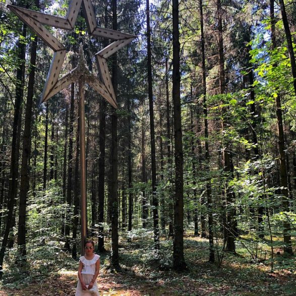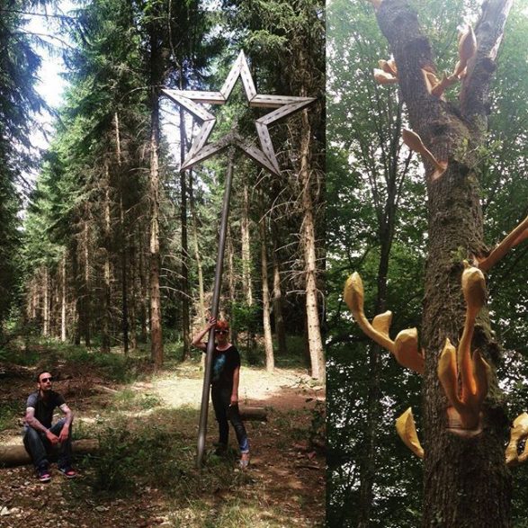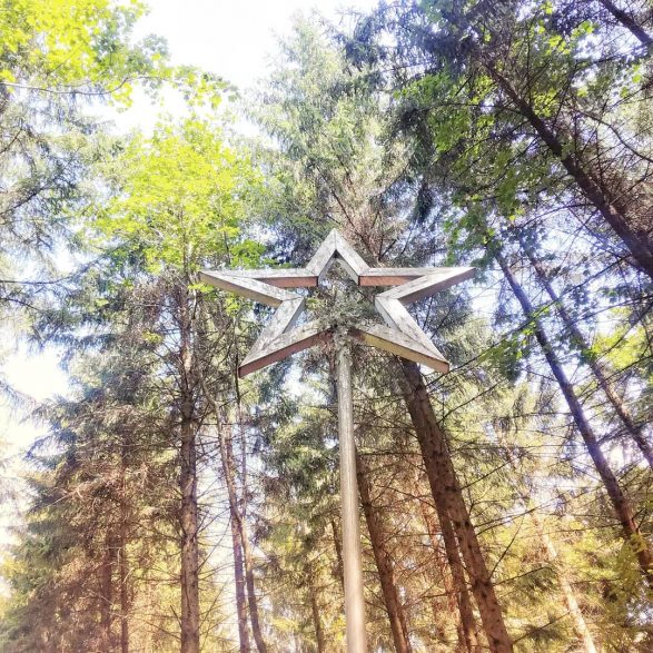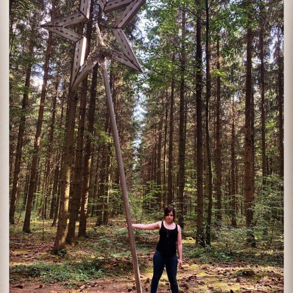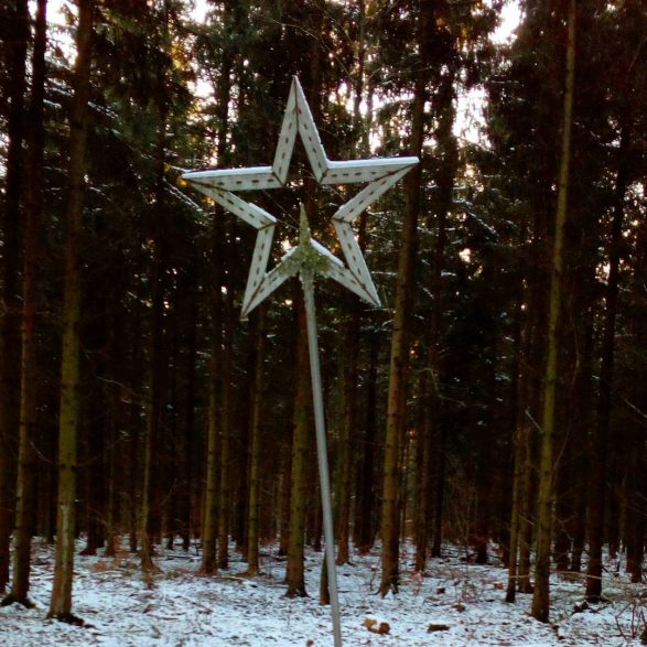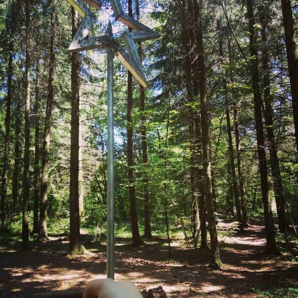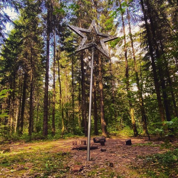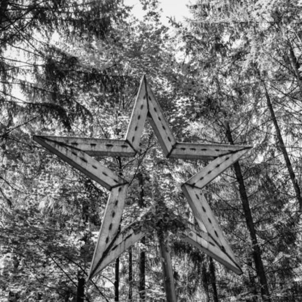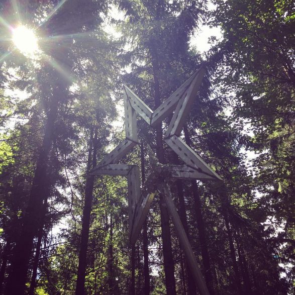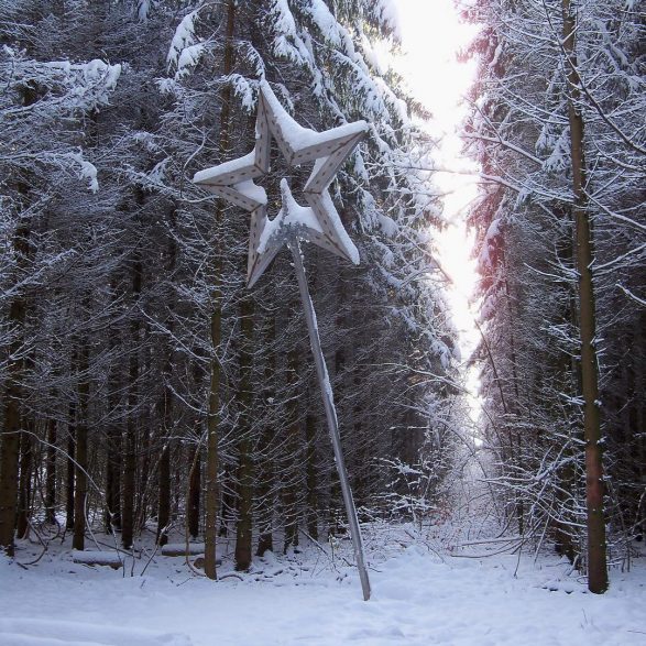 165Jean-Luc Verna plante une baguette magique monumentale dans le sol d’une sapinière pour réenchanter une région marquée par l’histoire, la guerre et l’exode. L’inclinaison de l’œuvre qui contredit la droiture des sapins, le dard dressé au centre de l’étoile et les points de suture visibles évoquent une menace et une violence rémanente. Un réenchantement comme un aiguillon de mémoire sur ce site désormais pacifié.