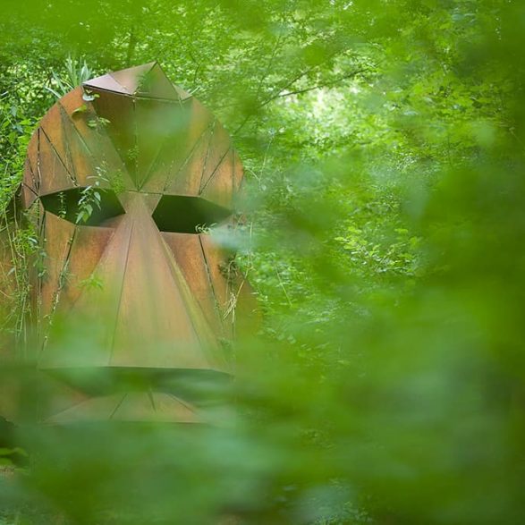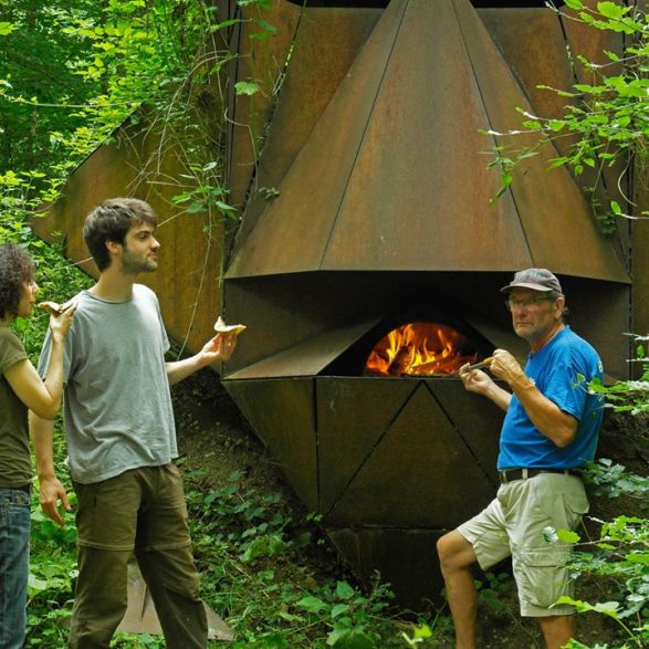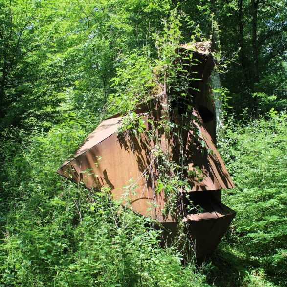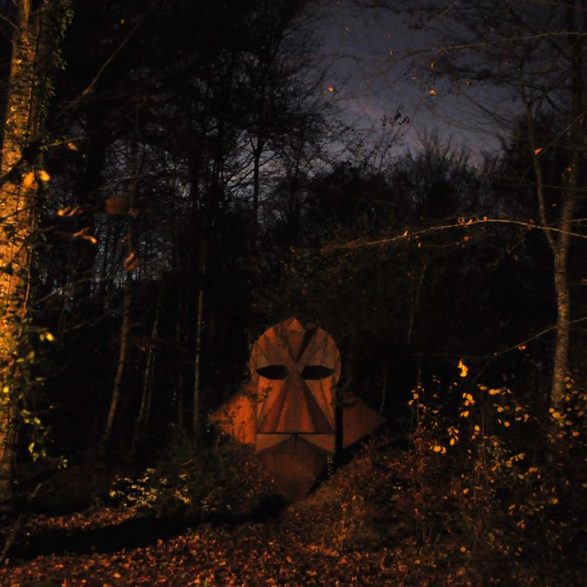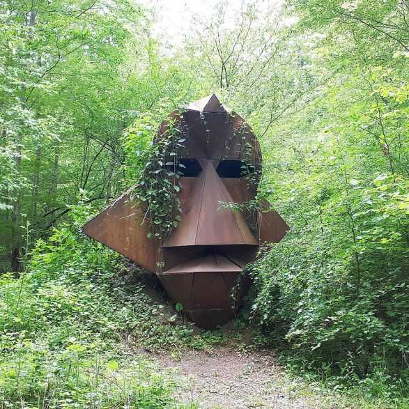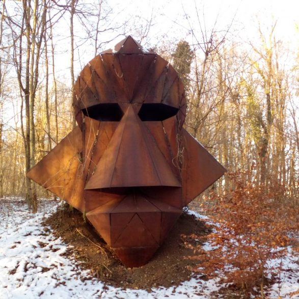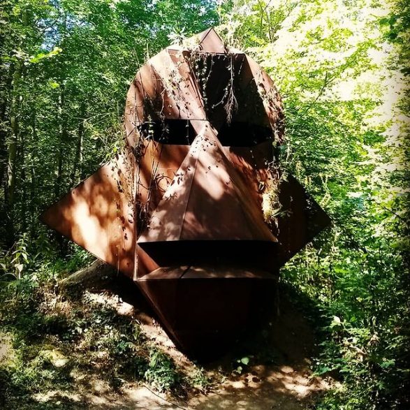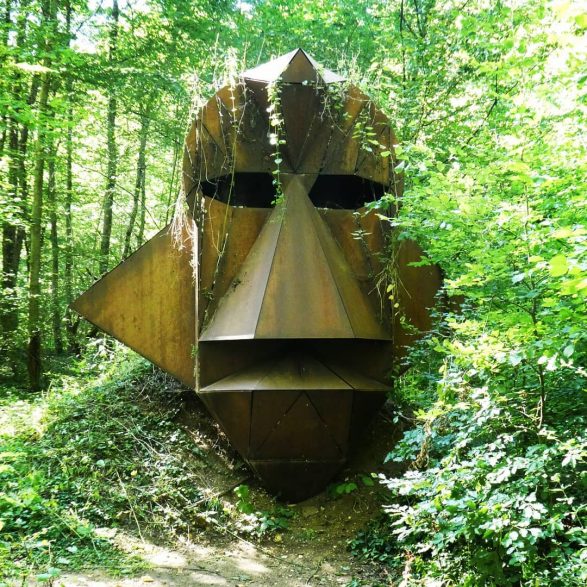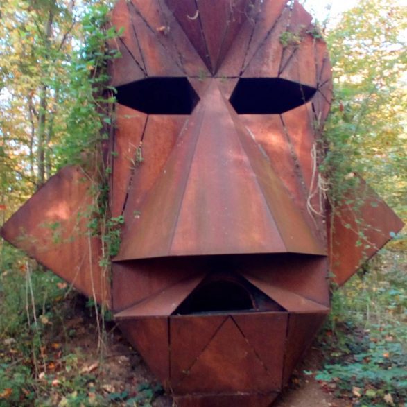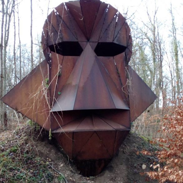 177Théodore Fivel a plié et fusionné des plaques d’acier pour fabriquer un masque colossal qui s’est couvert avec le temps d’une rouille protectrice. Située à proximité d’une source, dans un endroit accueillant de la forêt, cette tête dont la bouche renferme un four à pain invite le promeneur épicurien à partager un repas fraternel.