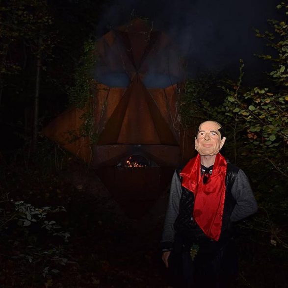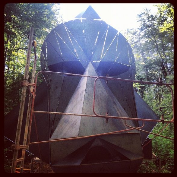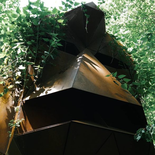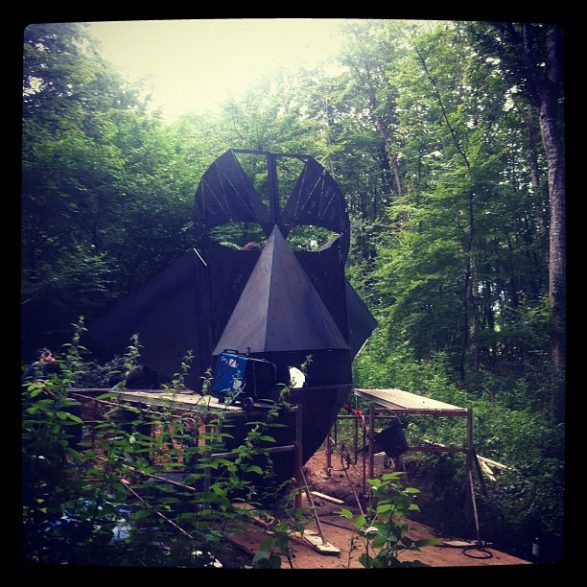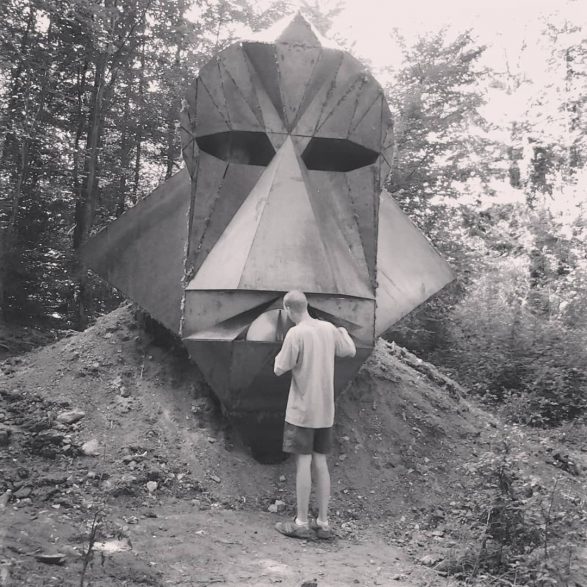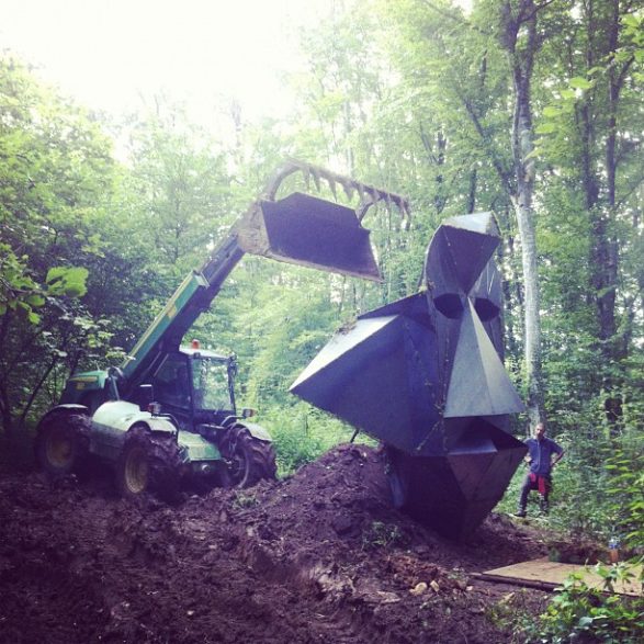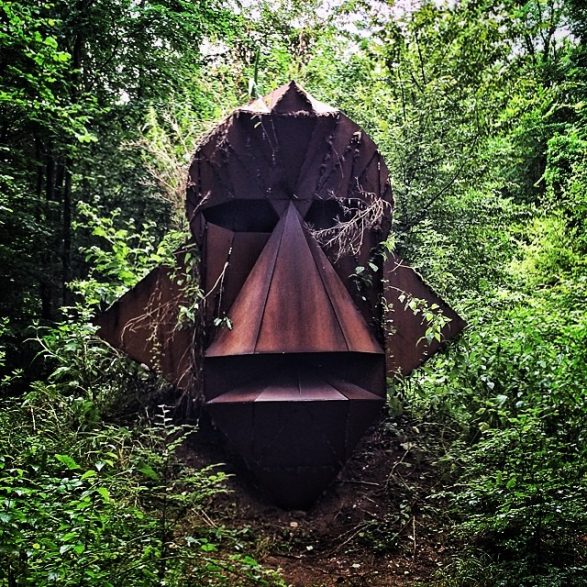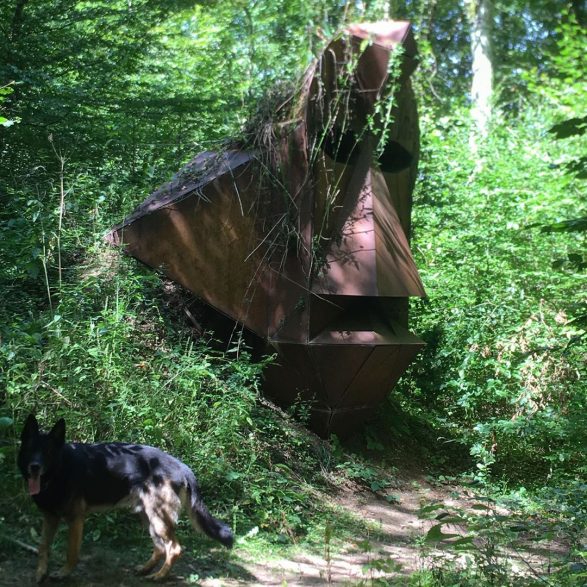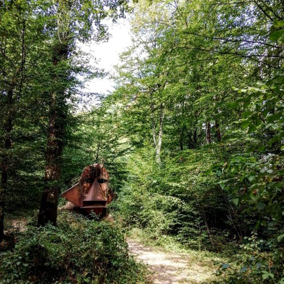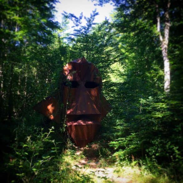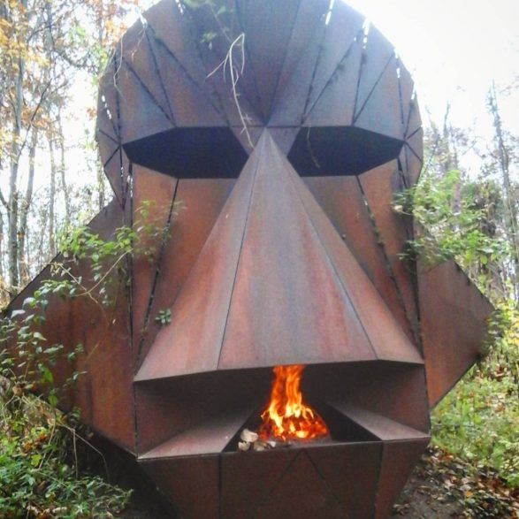 177Théodore Fivel a plié et fusionné des plaques d’acier pour fabriquer un masque colossal qui s’est couvert avec le temps d’une rouille protectrice. Située à proximité d’une source, dans un endroit accueillant de la forêt, cette tête dont la bouche renferme un four à pain invite le promeneur épicurien à partager un repas fraternel.