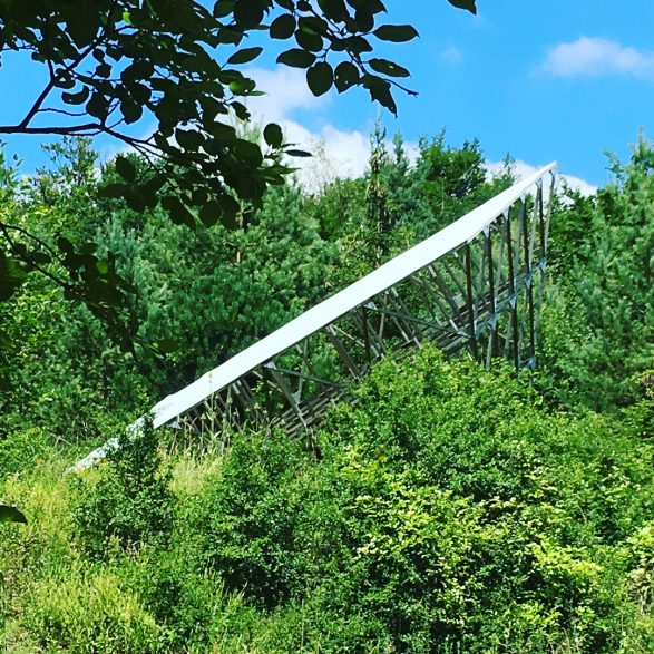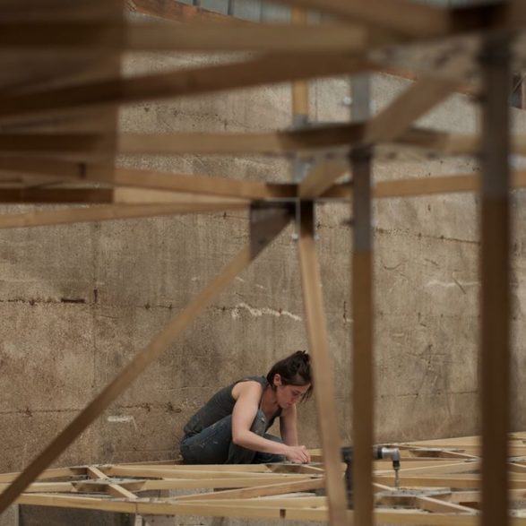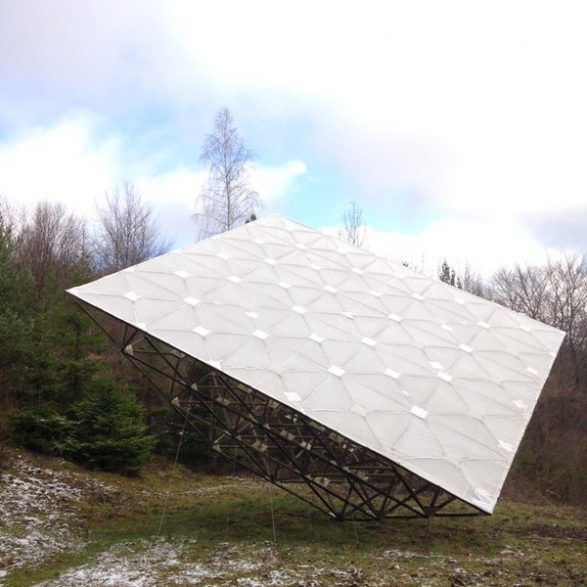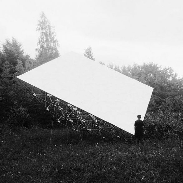 175Jennifer Caubet assemble une sculpture qui puise son inspiration dans la symbolique des cerfs-volants japonais, traditionnellement utilisés comme drapeau et emblème d’un territoire. Portée par une architecture en bois d’acacia et aluminium, la toile tendue dessine dans le paysage un impressionnant monochrome blanc dressé face au vent.