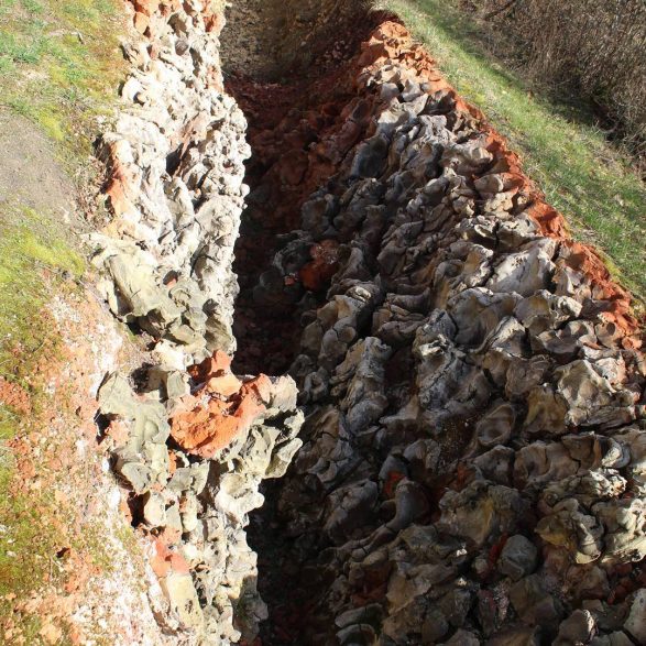 La tranchée découvre un sol argileux reposant sur une assise de cailloux qui proviennent de la dalle calcaire du sous-sol ayant été fracturée par le gel. Elle est creusée dans un layon entre deux parcelles qui durent être coupées à blanc après le passage de la tempête de décembre 1999. Dans le taillis, le noisetier concurrence fortement les essences dites « nobles », telles que le chêne ou le merisier qui ne pourront pas reprendre le dessus sans l’intervention des sylviculteurs.