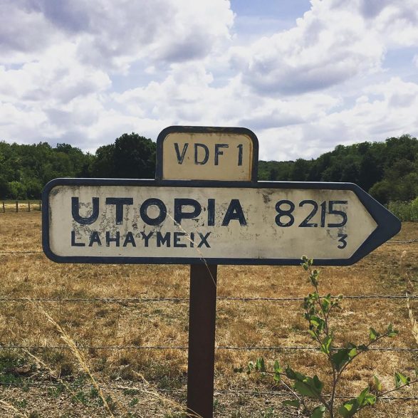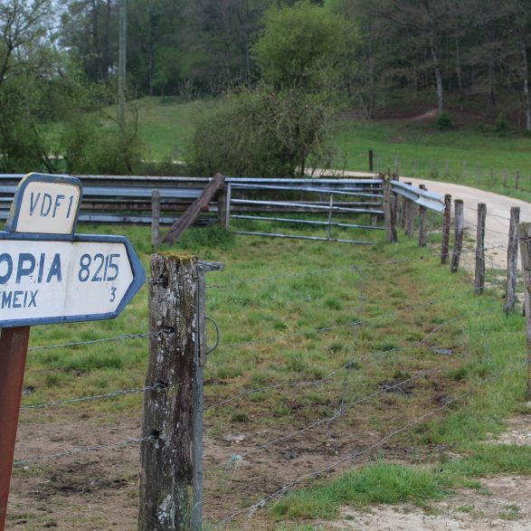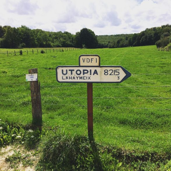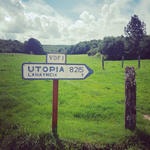 002Klaus Heid place à la croisée de deux chemins un panneau de signalisation indiquant la direction du lieu de naissance de Vent des Forêts à 3 km et celle de la ville d’Utopia à 8215 km aux Etats-Unis. Une petite communauté texane y poursuit l’utopie de l’écrivain Thomas More, celle de la ville idéale, imaginée par de nombreux auteurs, philosophes et architectes, parfaite par ses dimensions et l’épanouissement de ses habitants. Klaus Heid indique au marcheur le village de Lahaymeix et rend Utopia accessible, toute proche.