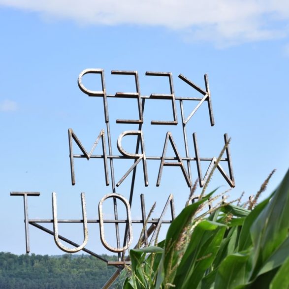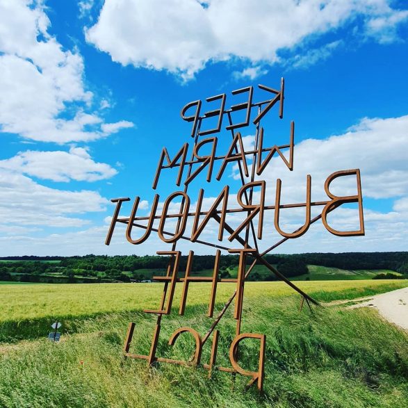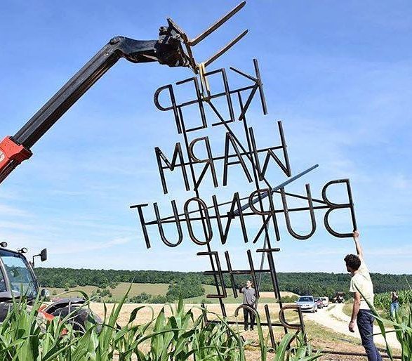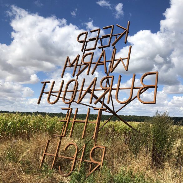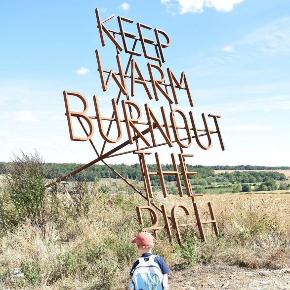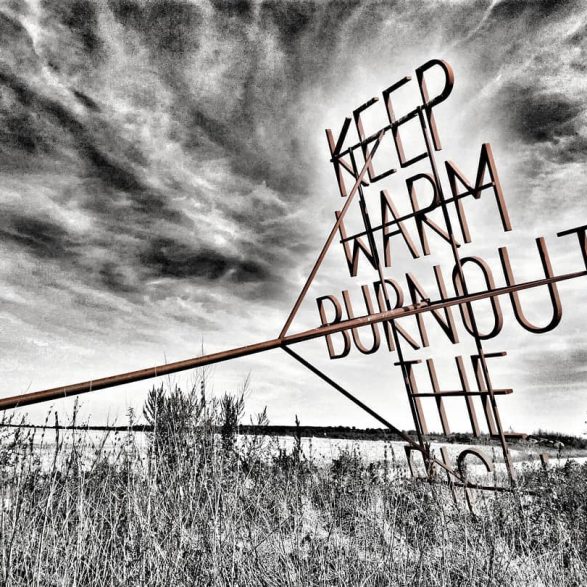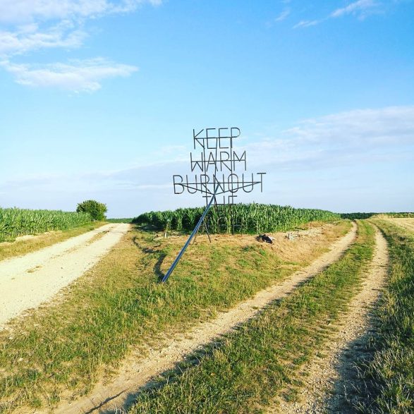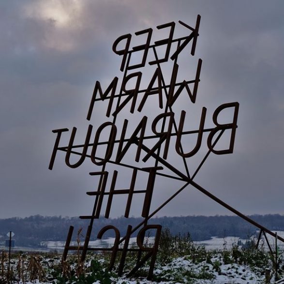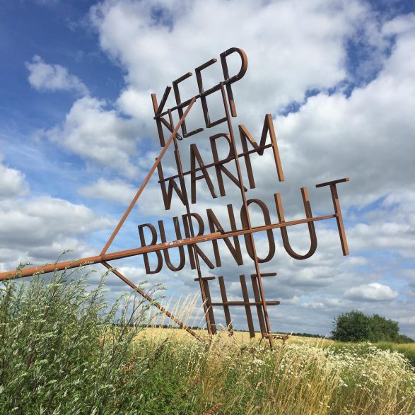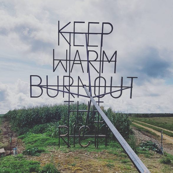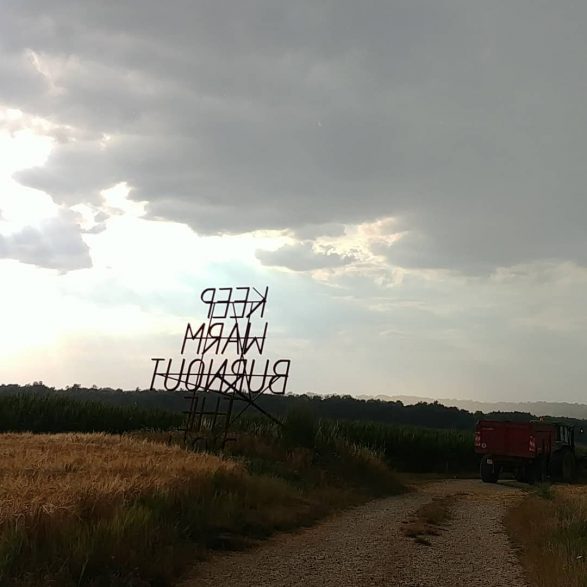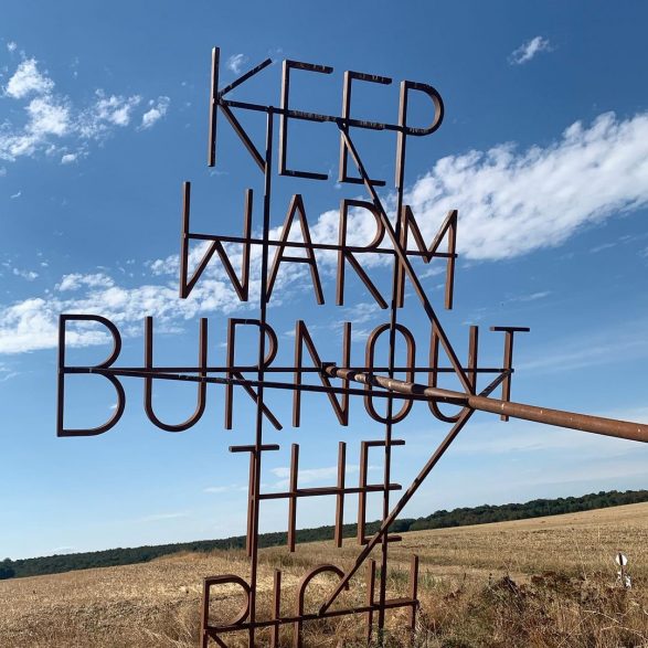 207Nøne Futbol Club s’inspire d’un graffiti vu sur un mur du quartier anarchiste d’Exarcheia à Athènes lors des manifestations de 2008 : « Keep Warm burnout the rich » (Restez chaud, brûlez les riches) et le transforme en un objet performatif ; un fer à marquer géant reprenant l’inscription. Le message est clair, mais la question se pose de savoir qui serait à même d’utiliser cet objet disproportionné. Installé à la croisée des chemins, en pleine campagne, ce message découpe le ciel de ses lettres d’acier.