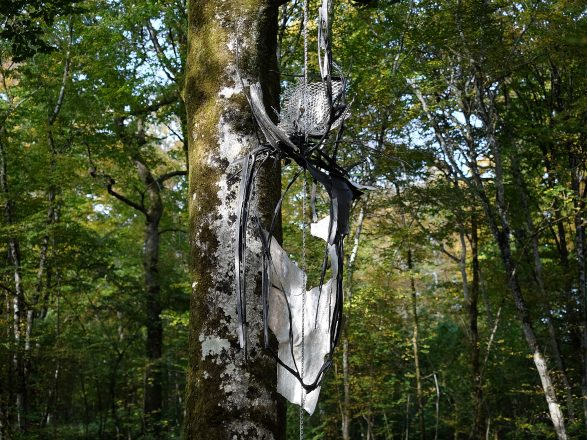 2010 Le Voile du Palais161Emmanuelle Lainé dépose dans les bois, non loin d’une source et d’un champ, une sorte de cocon, poche intestinale, cavité buccale ou refuge de fortune. Cet antre qui s’est recouvert …