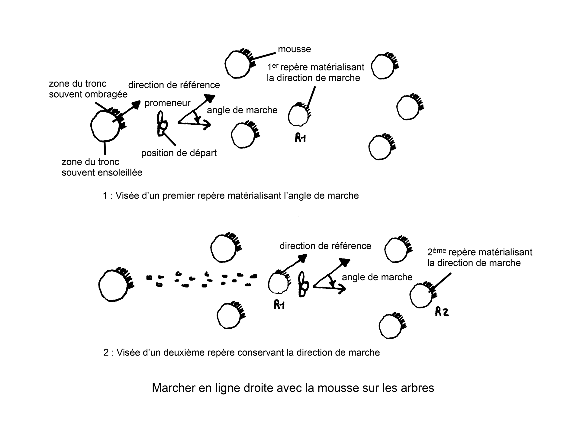 À la base de chaque tronc, la mousse est inégalement répartie. Elle occupe préférentiellement le secteur orienté au nord-est. La mousse aurait-elle le sens de l’orientation ? Rien n’est moins sûr, tandis que la sécheresse semble être ici le facteur empêchant son installation sur la partie du tronc orientée vers le sud-ouest. Cet emplacement étant exposé au soleil, la mousse ne pourrait pas survivre en se contentant de l’eau de pluie ruisselant sur le tronc. Sans être aussi précise que l’aiguille d’une boussole, la direction de référence ainsi matérialisée par la mousse pourra au moins vous permettre de progresser en ligne à peu près droite si vous venez à vous perdre dans une vaste forêt comme celle-ci. Vous éviterez ainsi de tourner inlassablement en rond !